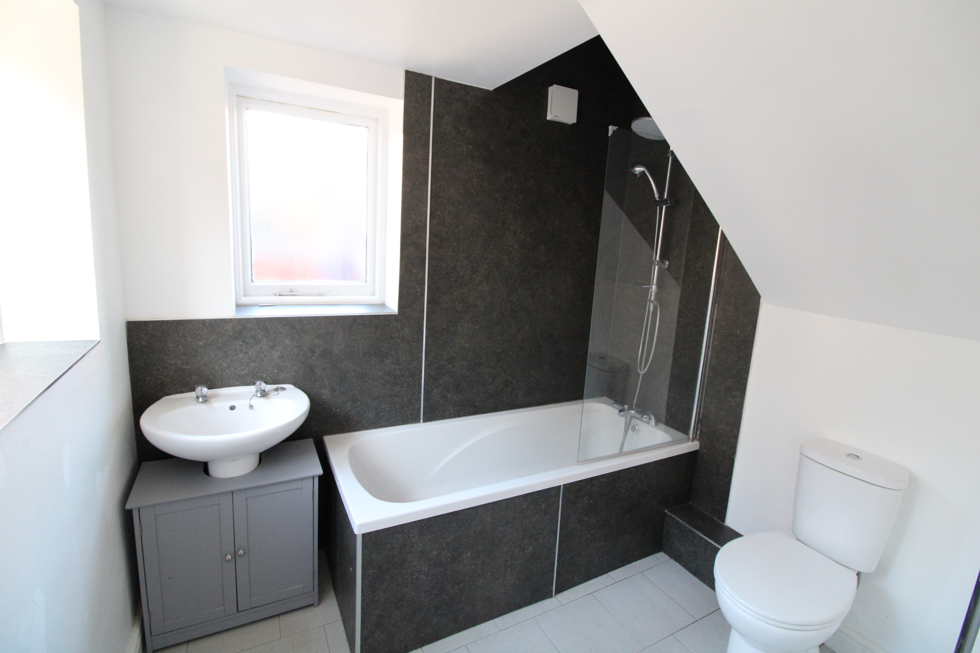 7’9” x 6’6” Fitted with a white WC, hand pedestal basin and panel bath with mains shower over.