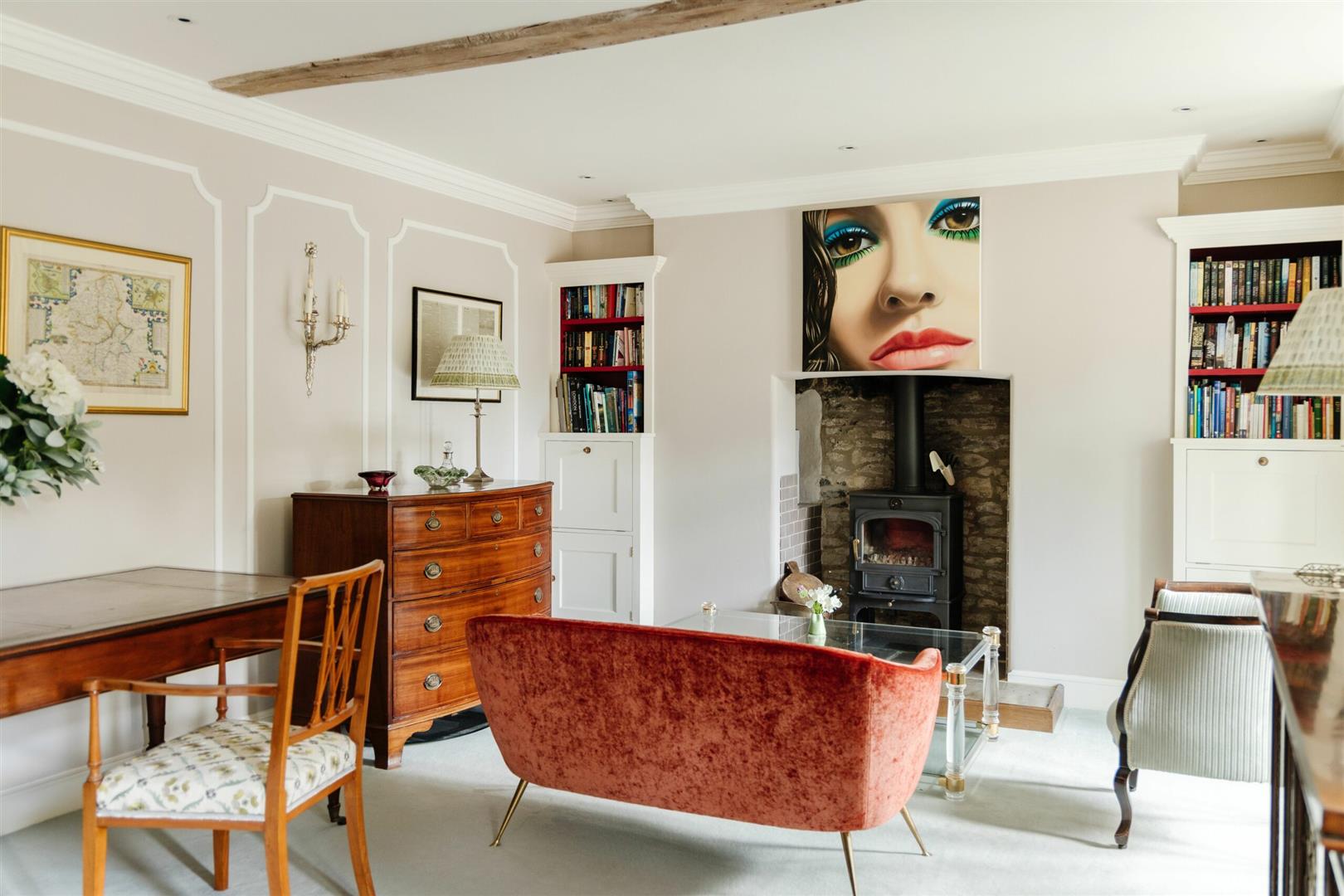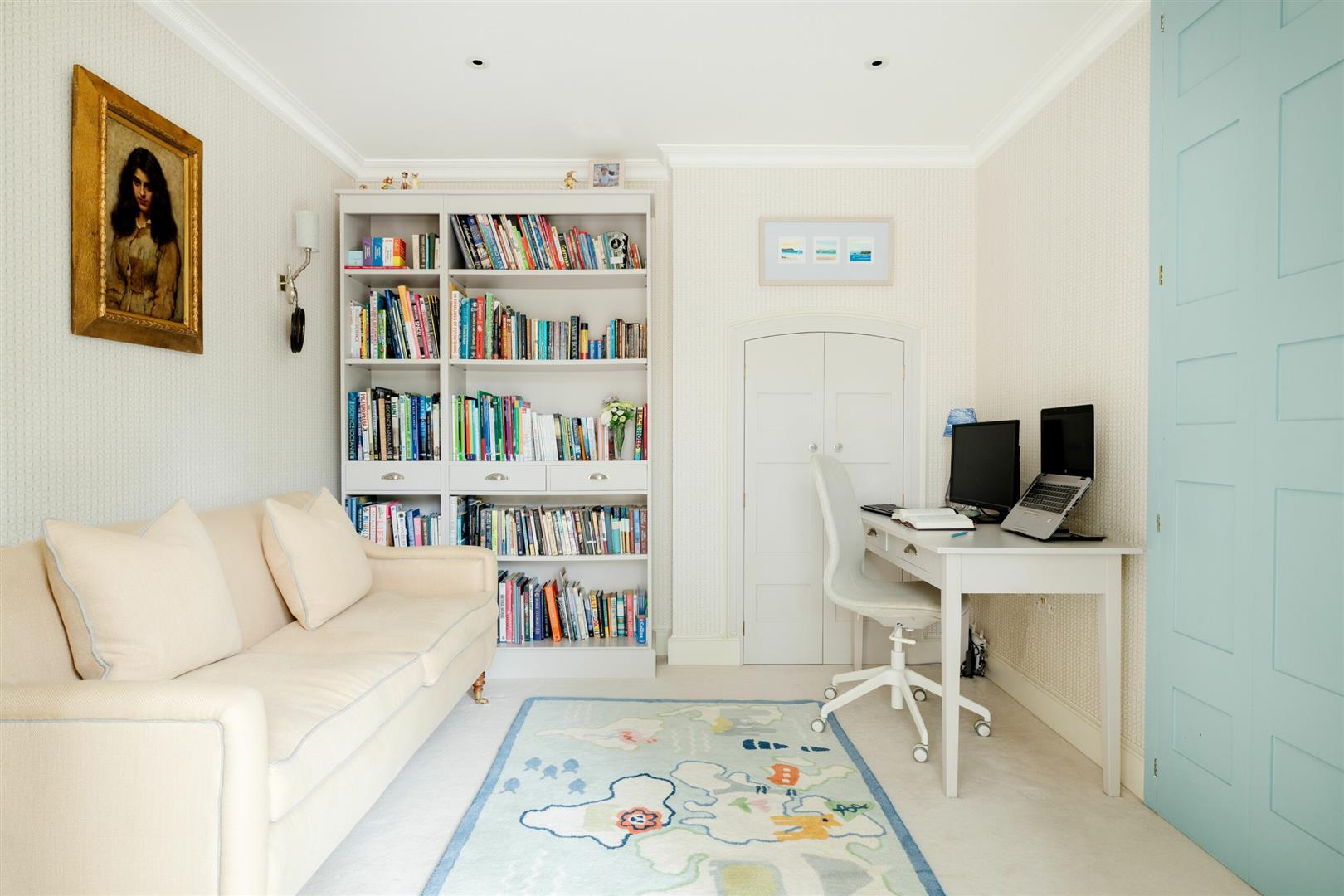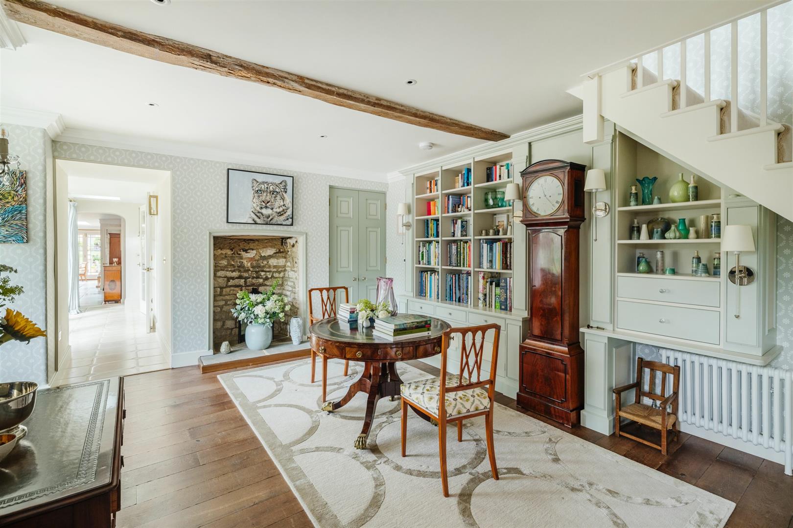 If you retreat back into the hallway, you'll find a study that peels off a stone framed arched corridor with glass panels, which sunlight radiates through and illuminates the whole space. This unique piece of architecture is subtle but gorgeous, as it combines the properties recent extensions with its original additions. The study is a relaxing space, where someone could easily work from home, take conference calls or for children to complete homework. The study can be made more private by closing the doors off from the corridor.
