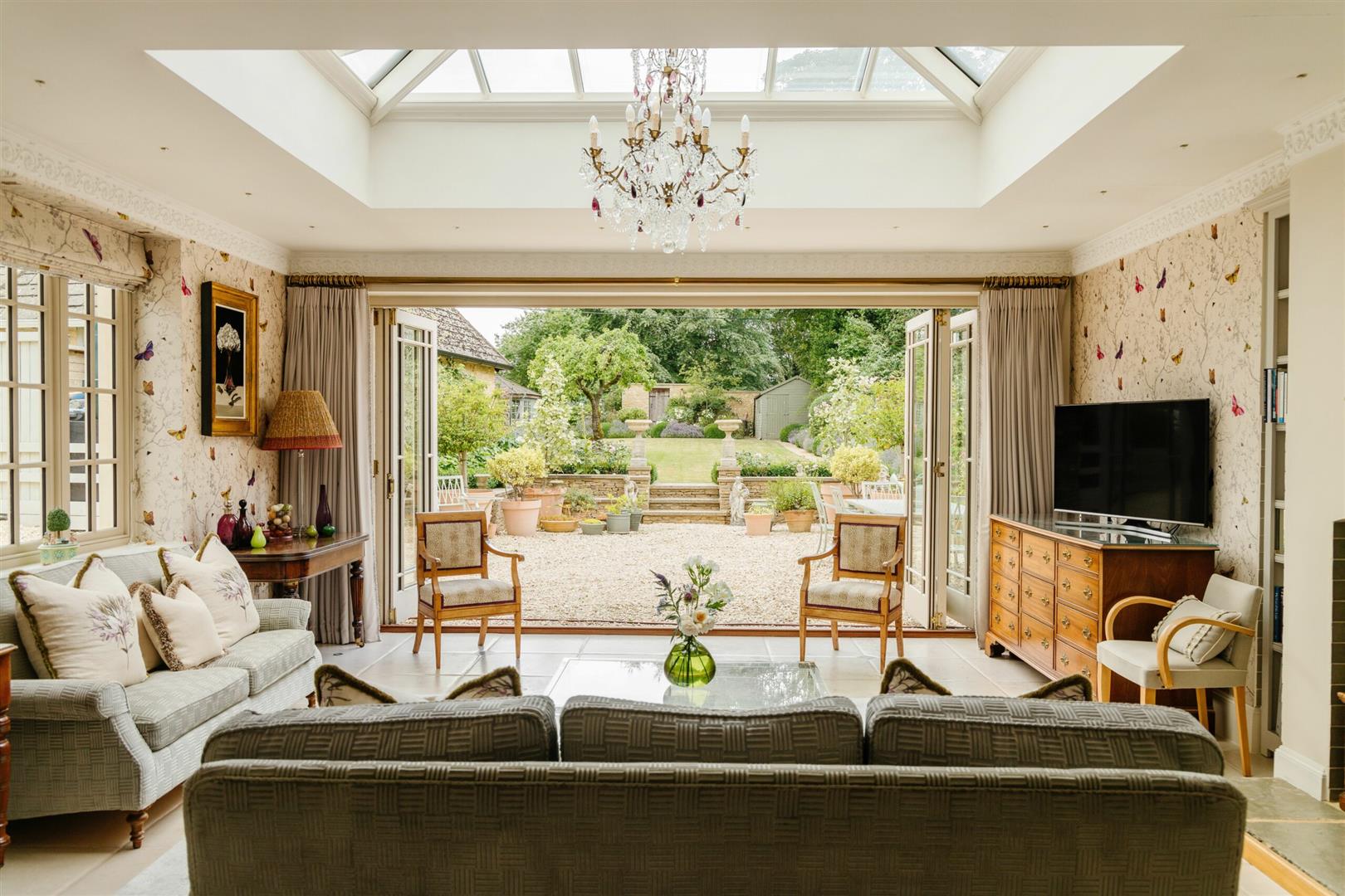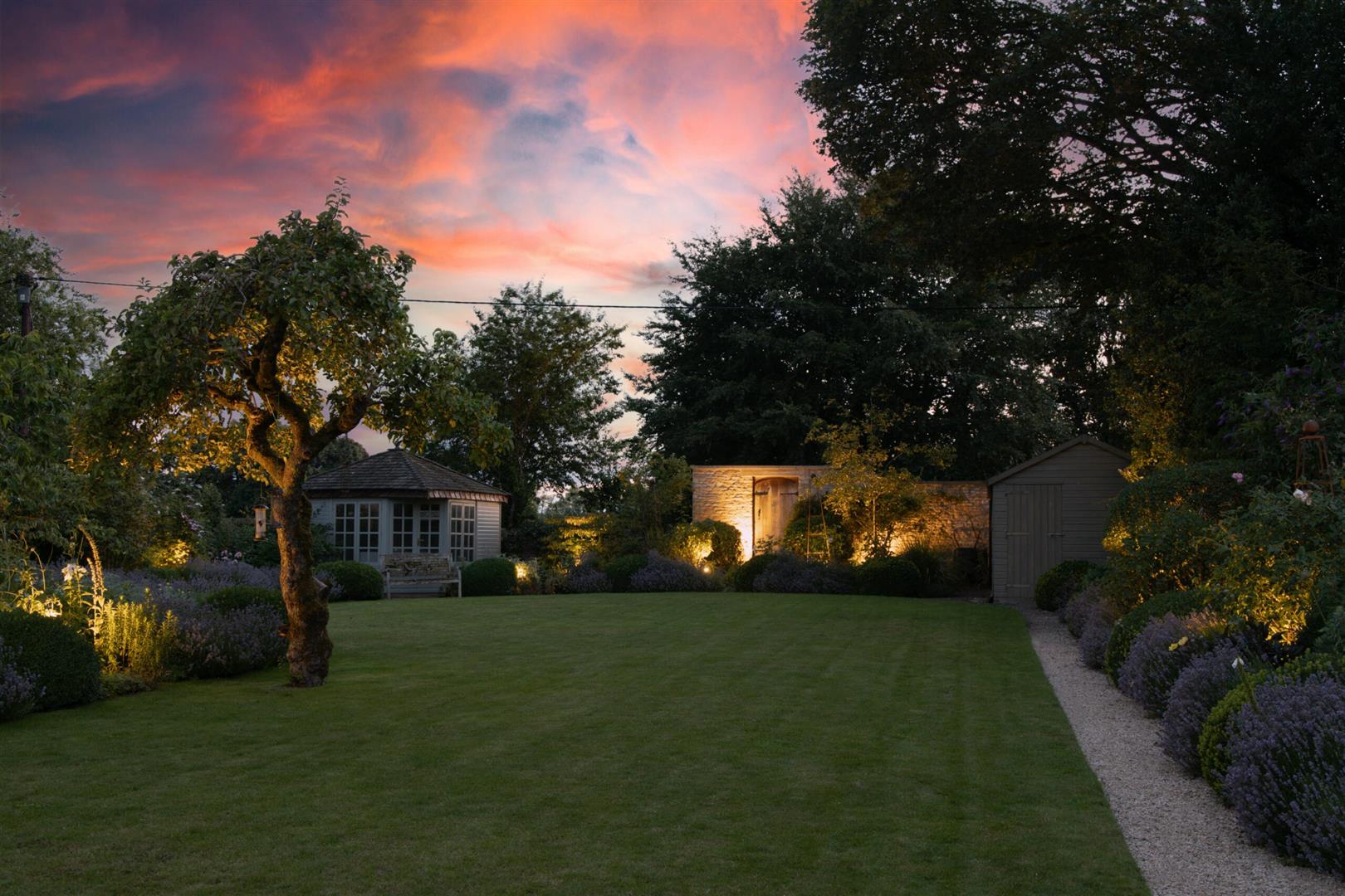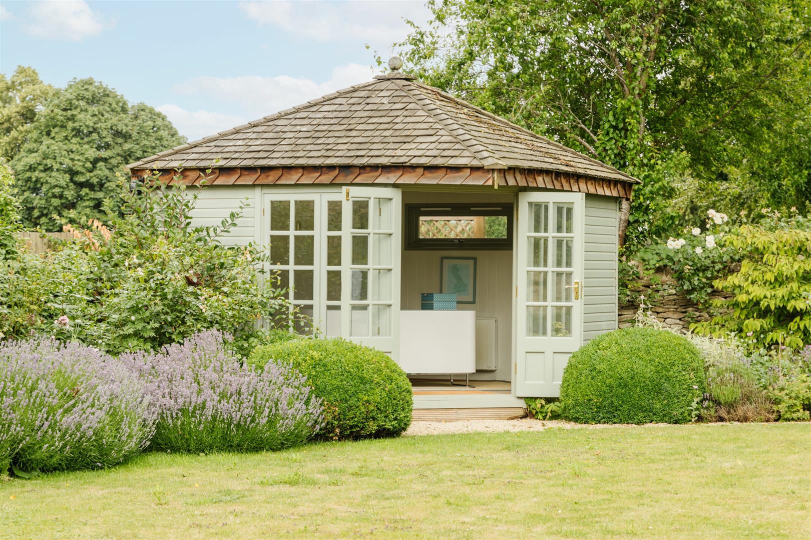 You walk out onto a graveled patio, which is an ideal space for outdoor dining where you can enjoy the sunshine or sunsets that paint the Burford sky. The garden is a large stretch of green lawn, which has been immaculately maintained. With borders of plants and lavender, bees and butterflies can be found fluttering around as well as birds tweeting from the trees which enhances the properties enchanting feel. At the end of the garden, there is a very sweet summer house
