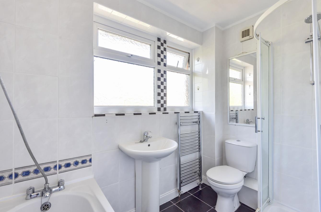 Bathroom: - 8'1" x 5'6" (2.46m x 1.68m) White suite with chrome fitments comprising bath, shower in cubicle, wash hand basin, WC, tiled floor, tiled walls.