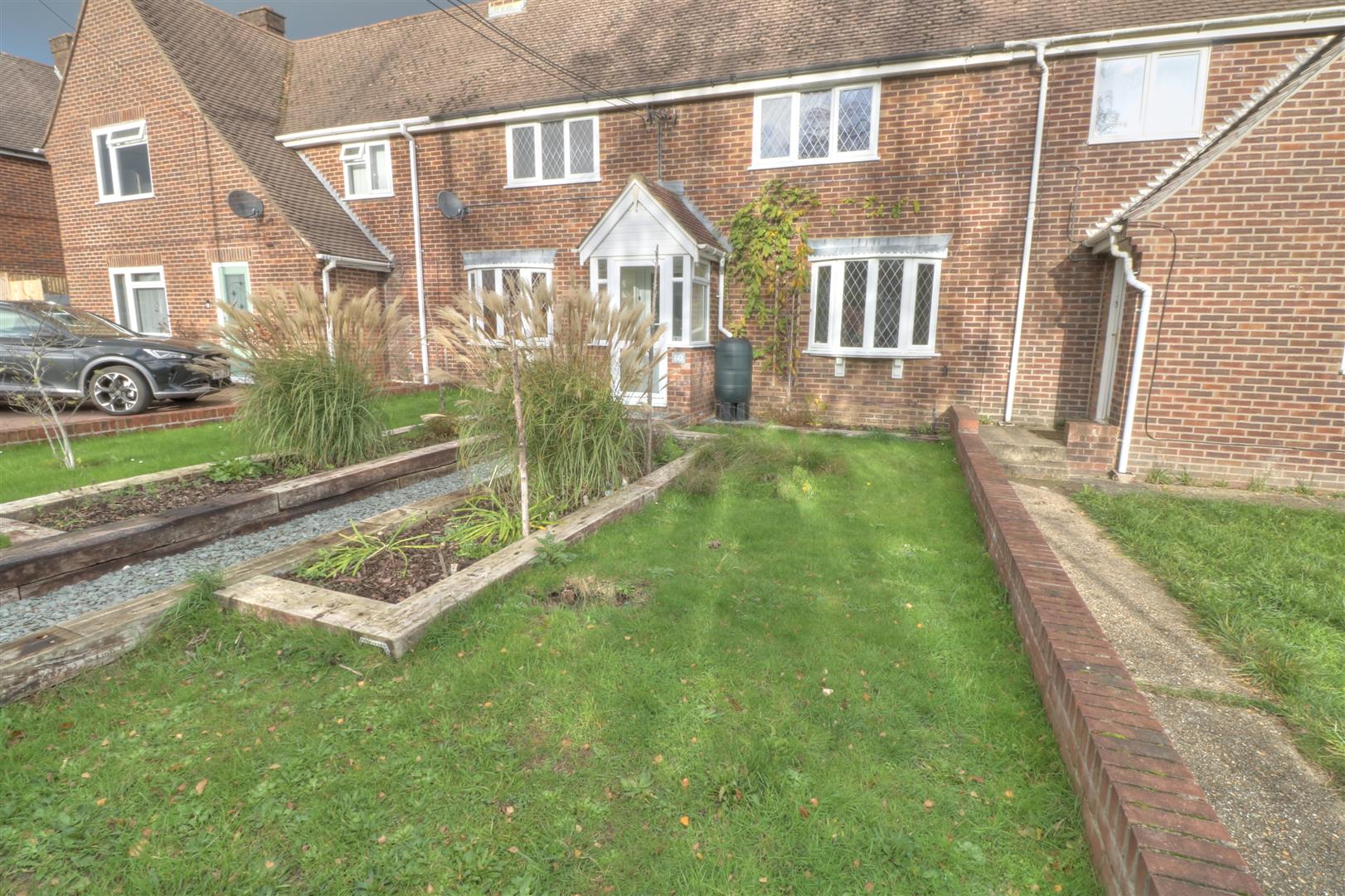 Front: - Area laid to lawn split by pathway, planted beds.