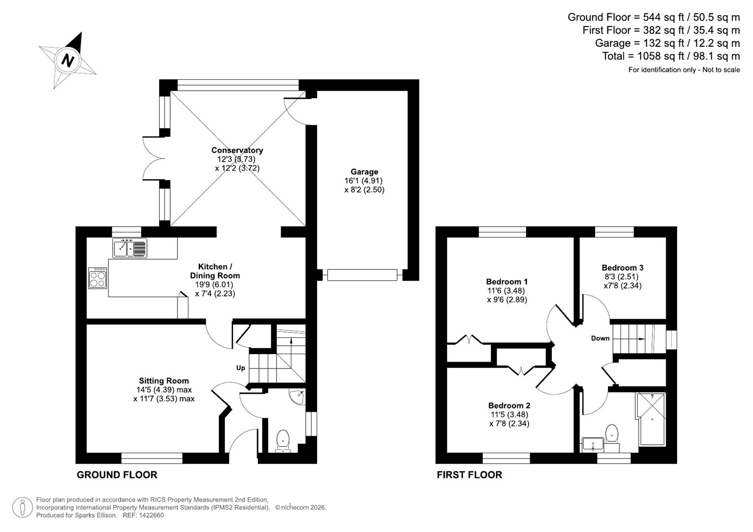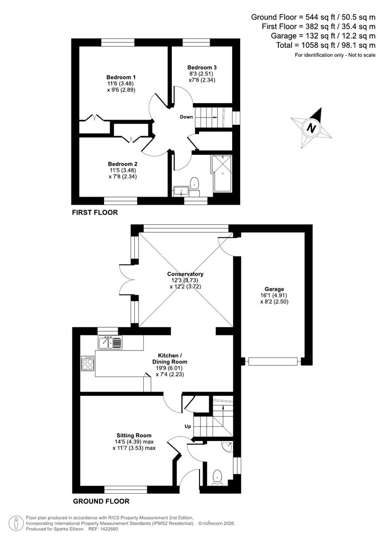 Approximate Area: - 1058 sq ft / 98.1 sq m