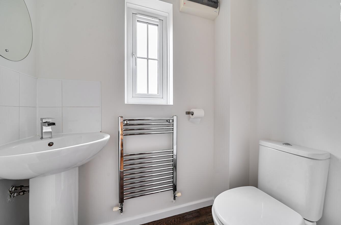 Cloakroom: - White suite with chrome fitments comprising WC, wash hand basin, chrome ladder radiator