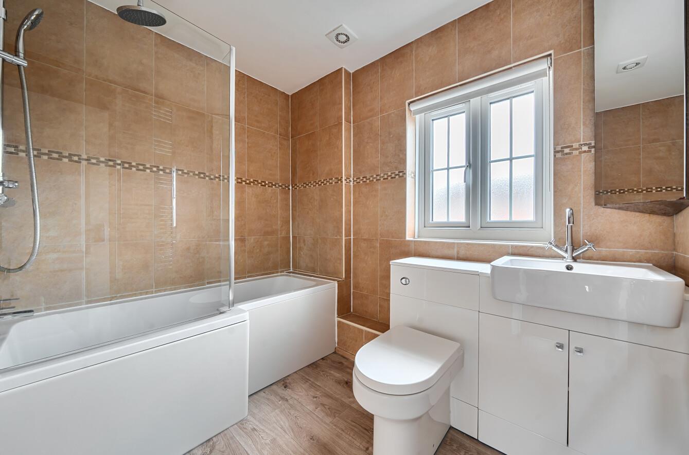 Bathroom: - White suite with chrome fitments comprising bath with shower over and glass shower screen, wash hand basin with vanity unit under, WC, tiled walls, chrome ladder radiator.