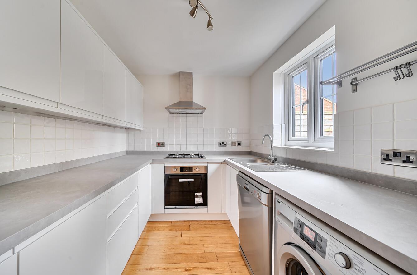 Kitchen/Dining Room: - 19'9" x 7'4" (6.01m x 2.23m) Newly fitted kitchen with a range of off-white flat fronted glossy wall and base units with a grey mottled worktop and upstand, fitted electric oven with gas hob and extractor hood, fridge freezer, washing machine, dishwasher, space for table and chairs, oak flooring.