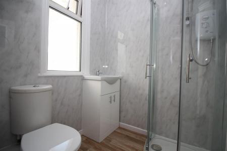 Corner shower cubicle with electric shower, white low level W.C, vanity hand wash basin with mixer tap, panelled walls, vinyl flooring, double glazed obscure window to rear aspect.
