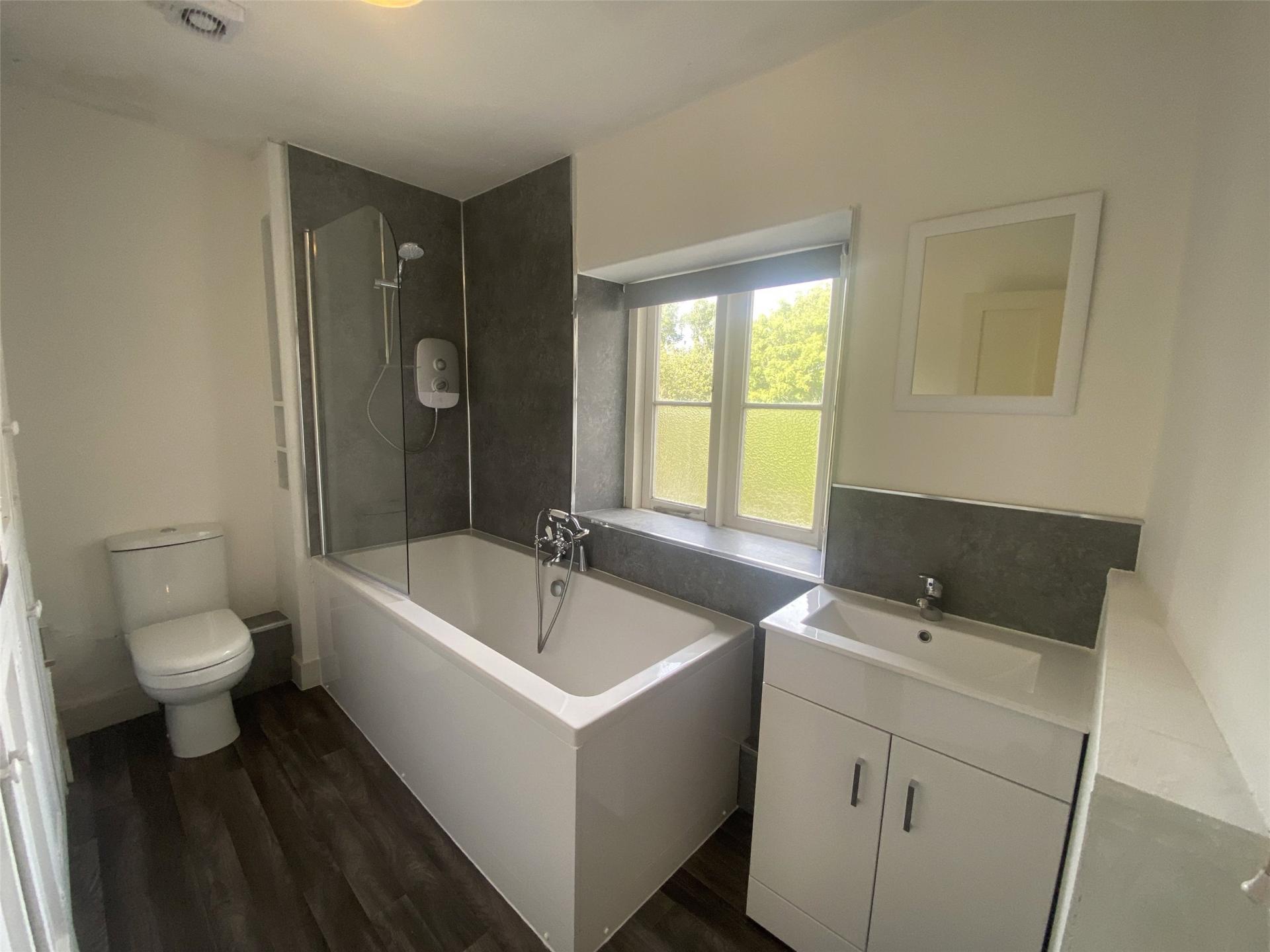 The bathroom has a wash hand basin, toilet and panelled bath with wall mounted electric shower.