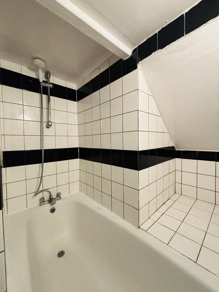 BATHROOM White suite comprising bath with shower over, wash hand basin, wc, radiator, mosaic flooring, fully tiled walls, extractor.
