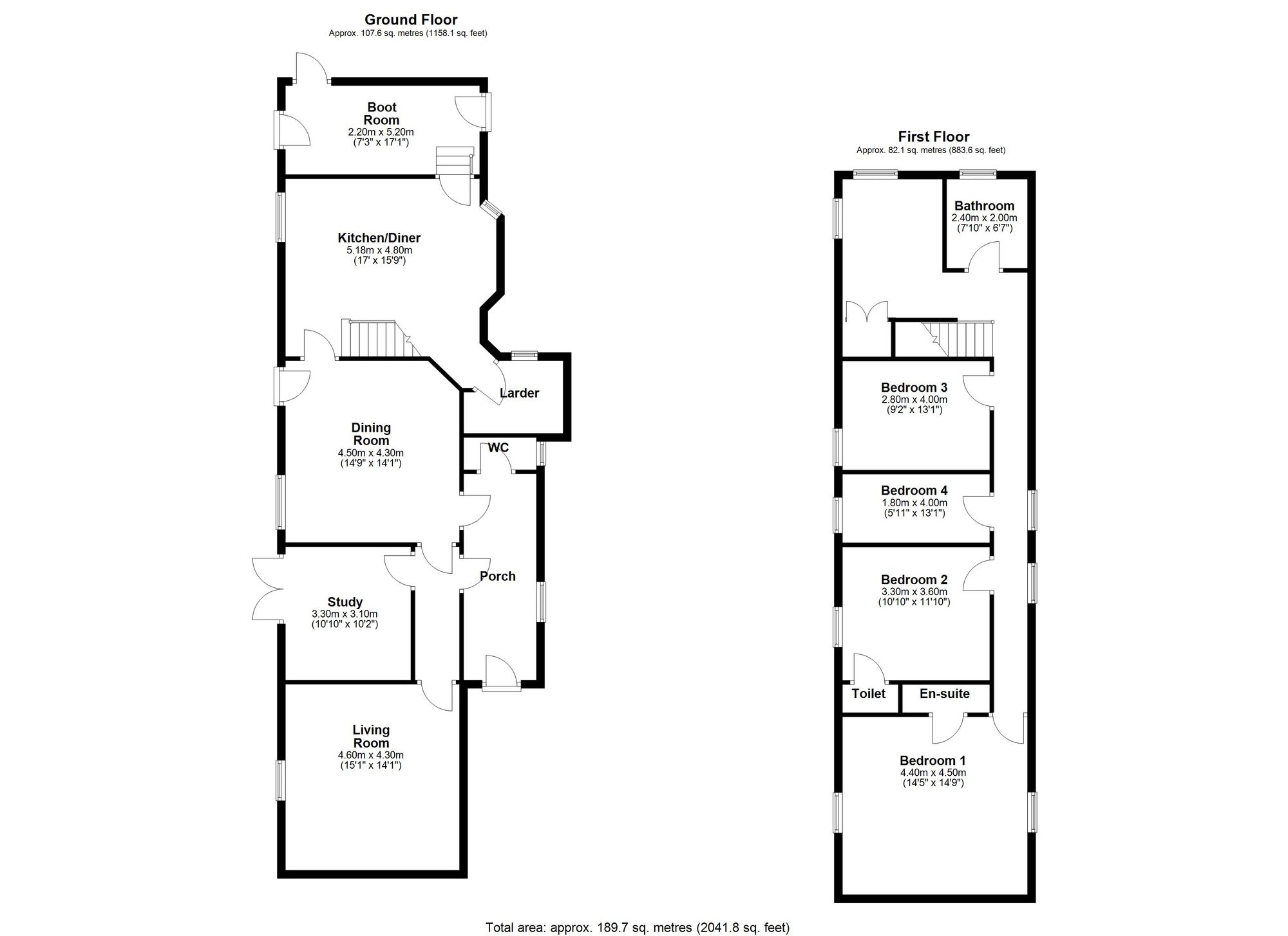 The accommodation is split across two floors. The ground floor consists of a large, country style kitchen/dining room, living room, separate dining room as well as a study, w/c, utility room and boiler room. On the first floor there are three large double bedrooms, (two of these are ensuite/WC) and one single bedroom, as well as the family bathroom. There are lots of character features throughout the property which include window seats and exposed beams.