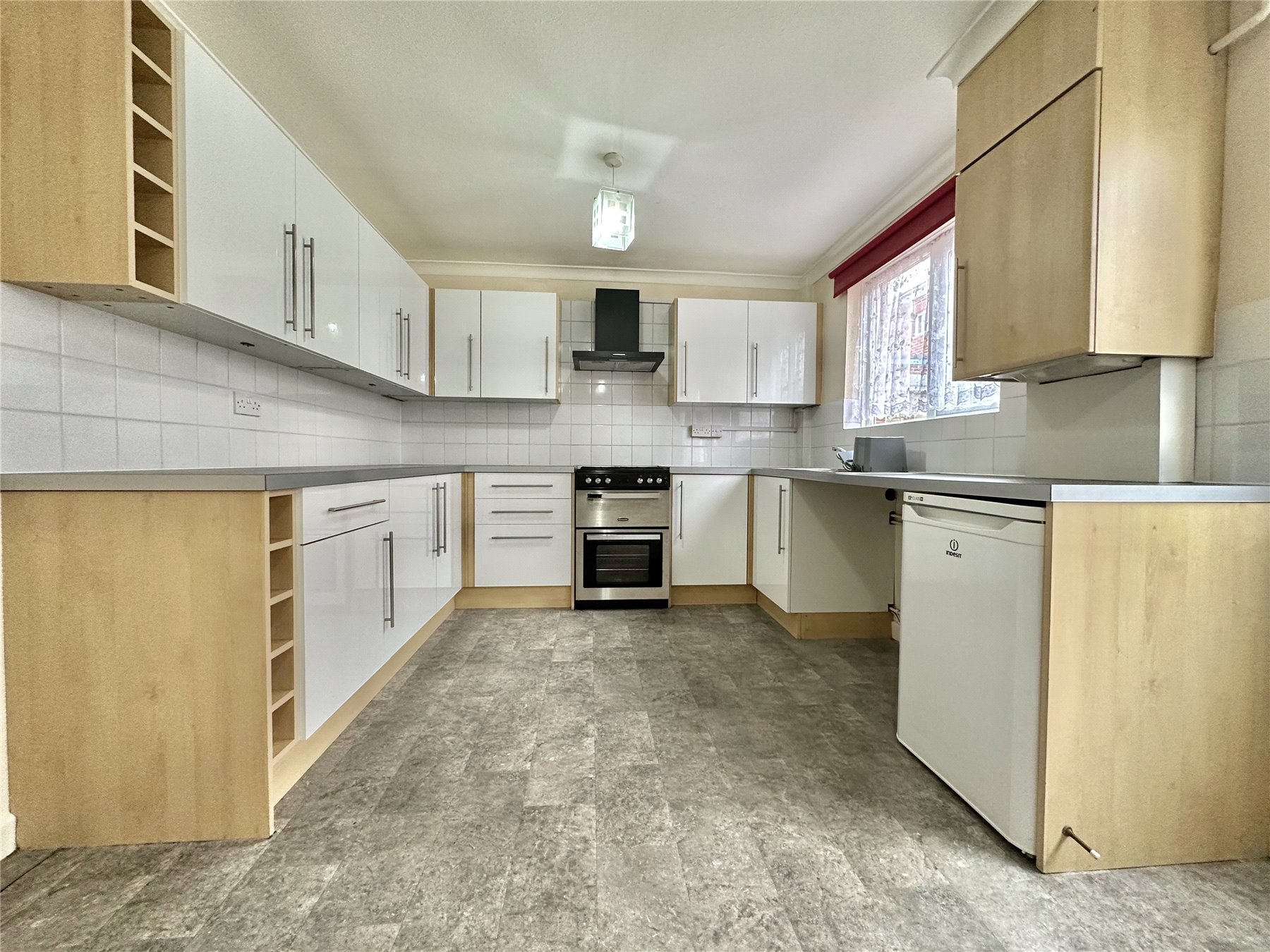 KITCHEN / DINER 18'1" x 10' (5.5m x 3.05m). Modern kitchen with electric cooker, four ring gas hob and fridge. Base and wall mounted cupboards and drawer units. Stainless steel sink and drainer. Under stairs cupboard. Double glazed window and door that leads out to patio garden.