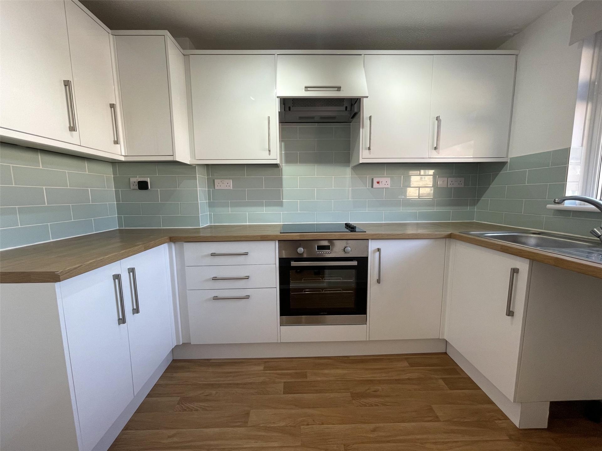 Kitchen 10' x 6'4" (3.05m x 1.93m). Modern fitted kitchen with a range of wall and base units with working surfaces over, winodw to front elevation, inset stainless steel sink and drainer, integrated oven, electric hob with extractor over and space for fridge freezer.