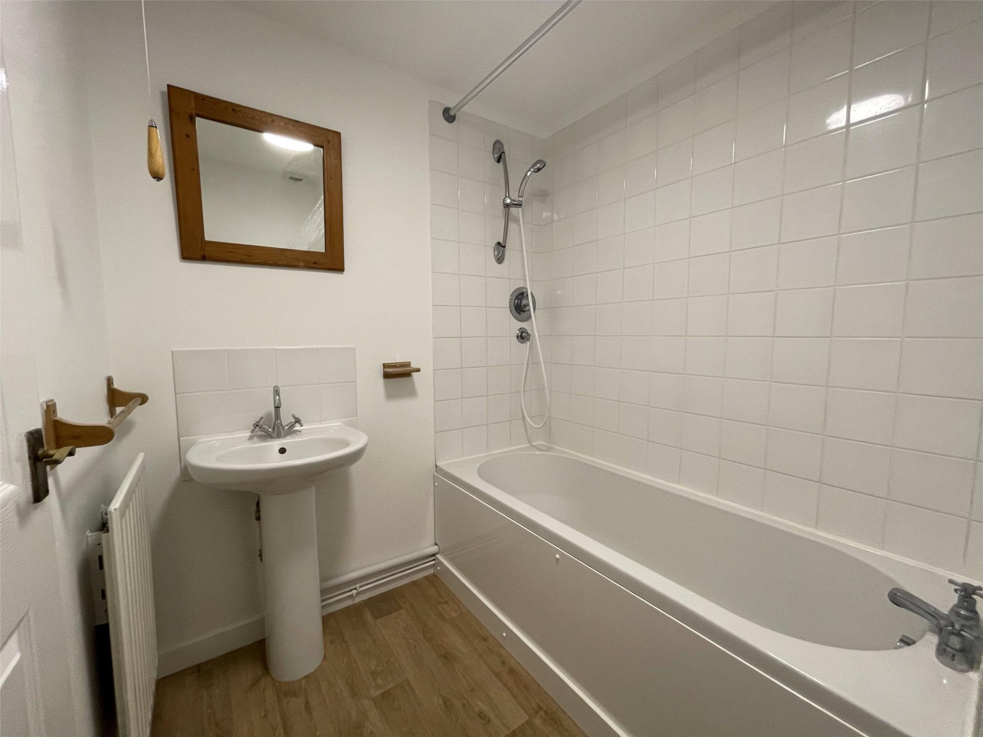 Bathroom 7'2" x 5'11" (2.18m x 1.8m). 3-piece modern suite with panelled bath with shower attachment over and fitted screen, pedestal wash hand basin and low level w.c.