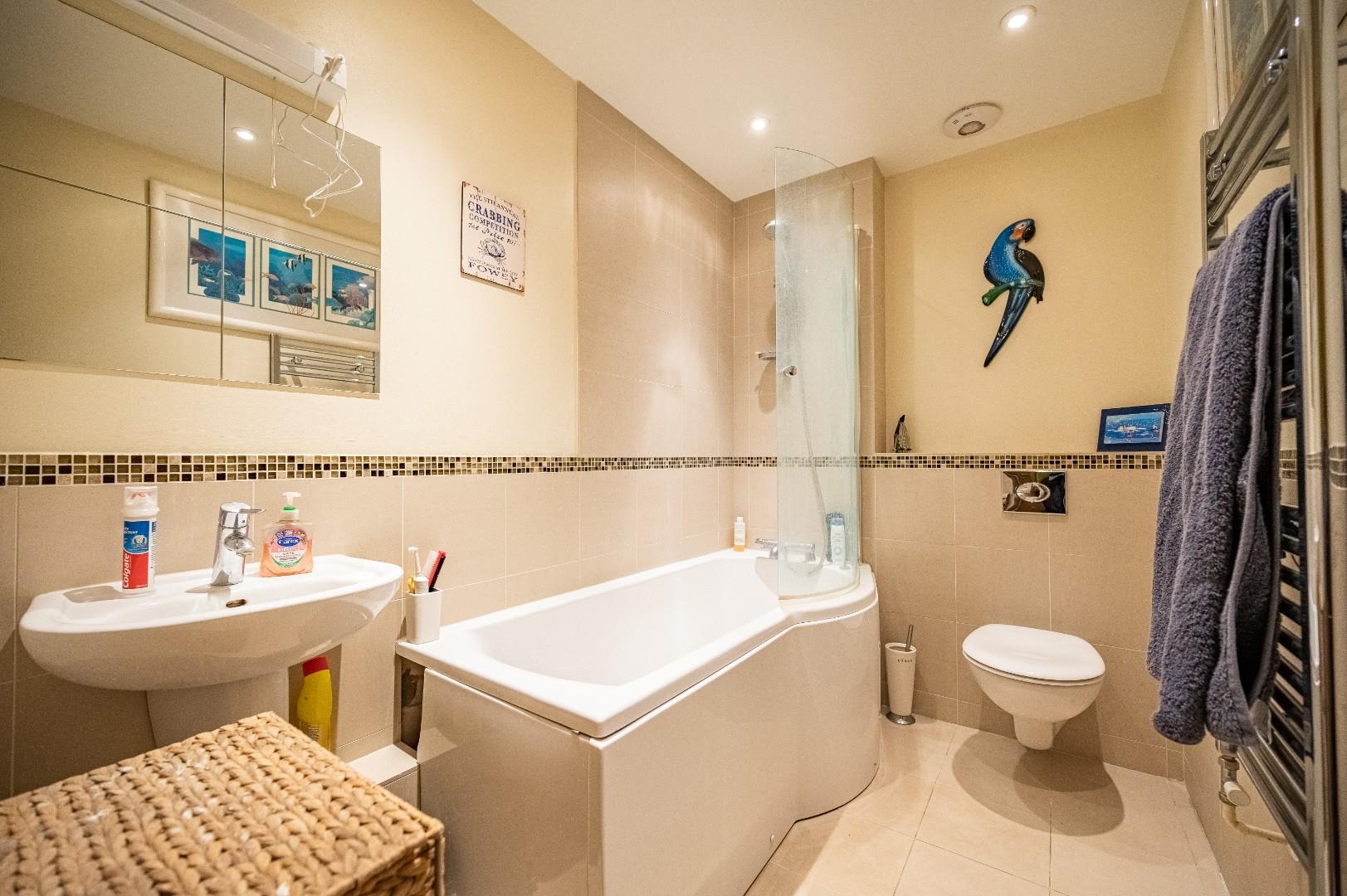 Bathroom - Enclosed P-bath with mixer taps & shower attachment, W.C, wash hand basin, heated towel rail, extractor fan, inset spotlights, part tiled walls, tiled flooring.
