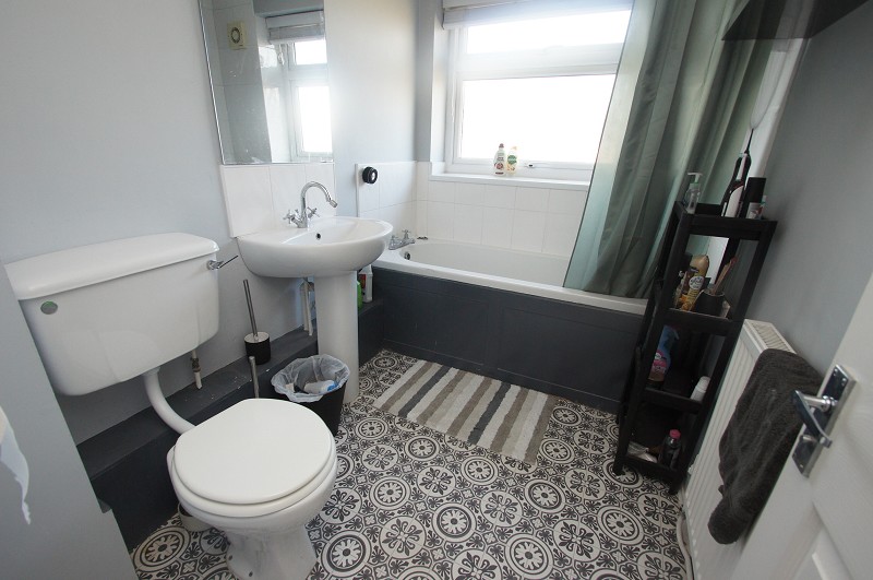 bath shower, close coupled WC and pedestal wash hand basin. Single radiator.