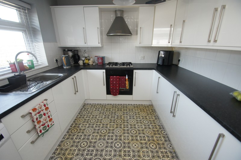 Good sized kitchen fitted with contemporary units in white gloss finish with complementary dark work surface. Comprising 8 base, 8 wall unit with 1 x 3 drawer unit, integral electric oven and gas hob with over hob hood air filter, single sink/drainer with matching mixer tap in stainless steel
