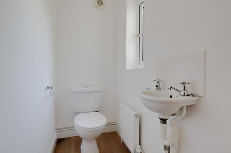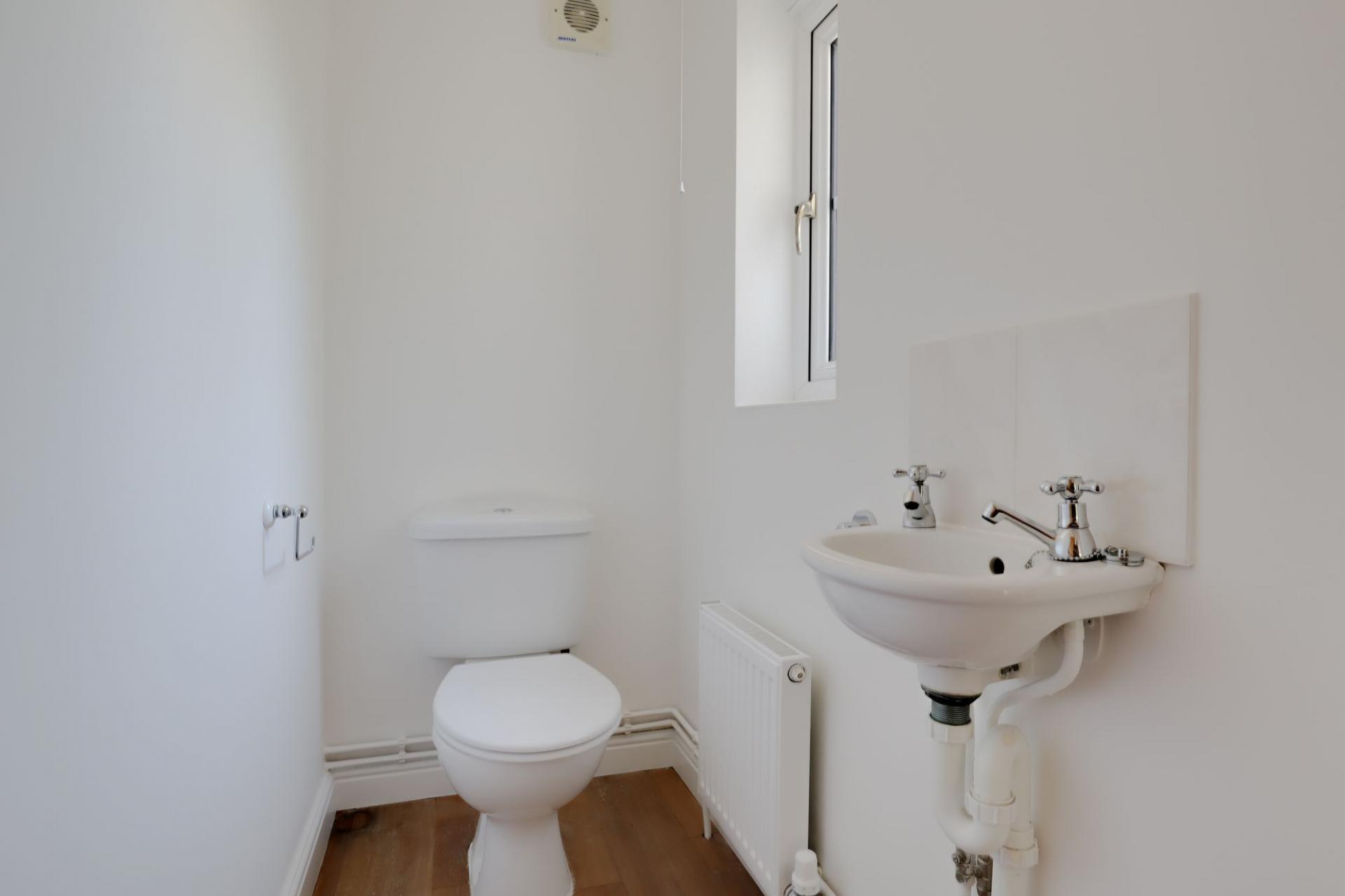 The property opens into an entrance hall with a convenient downstairs cloakroom, leading through to a modern fitted kitchen arranged to work well for everyday cooking and storage. To the rear, the sitting room provides a welcoming space to relax, enhanced by real wood flooring and French doors that open directly onto the enclosed rear garden. This sunny outdoor space is ideal for enjoying warmer days and also offers direct access to the single garage located on a nearby block.