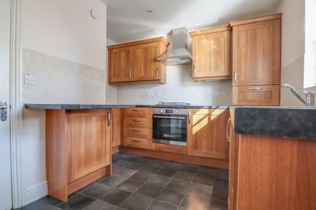 To the front of the property, the kitchen is fitted in a modern shaker style with wood-effect cabinetry that offers both warmth and practicality. The layout provides ample cupboard storage and preparation space, creating a kitchen that works well for everyday cooking as well as relaxed weekend meals.