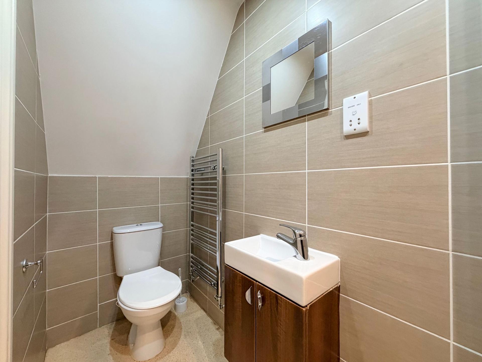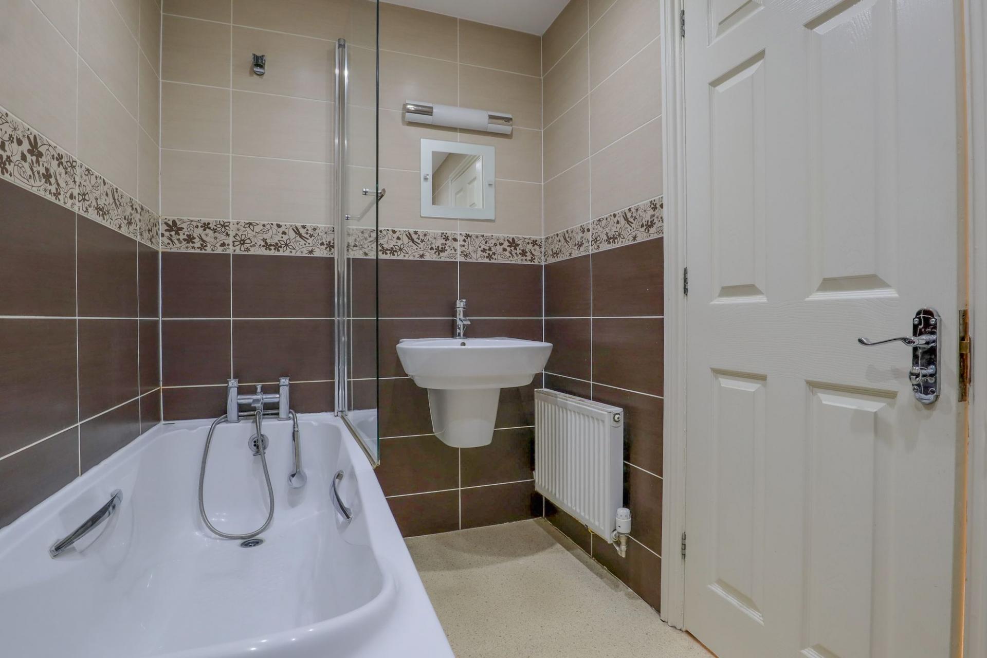 Upstairs, the property offers three well-sized bedrooms. The principal bedroom benefits from built-in storage and its own ensuite shower room, creating a comfortable and private retreat. Two further double bedrooms provide flexible accommodation that could suit guest rooms, shared living arrangements or a dedicated home office where required. The family bathroom is fitted with a modern suite and includes a shower over the bath.