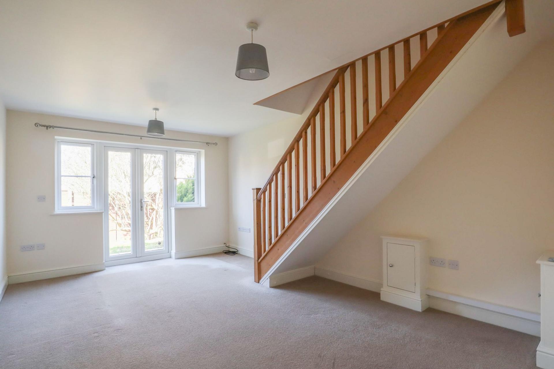 The entrance leads through to a bright and welcoming sitting room positioned at the rear of the property. French doors open directly onto the enclosed garden, allowing natural light to fill the room and creating an easy connection between indoor and outdoor living. The space is well suited to a comfortable lounge arrangement with room for dining if desired, making it equally practical for quiet evenings at home or for hosting friends.