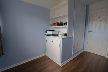 BEDROOM THREE – Single room with built-in shelving unit, storage cupboard & wardrobe. Window to front aspect.