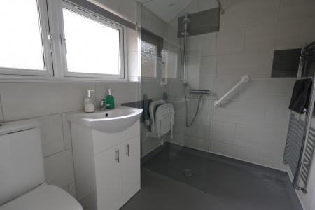 WET ROOM – Modern suite with walk-in shower, toilet, hand basin with storage underneath, heated towel rail, airing cupboard and cupboard housing boiler. Non-slip flooring.