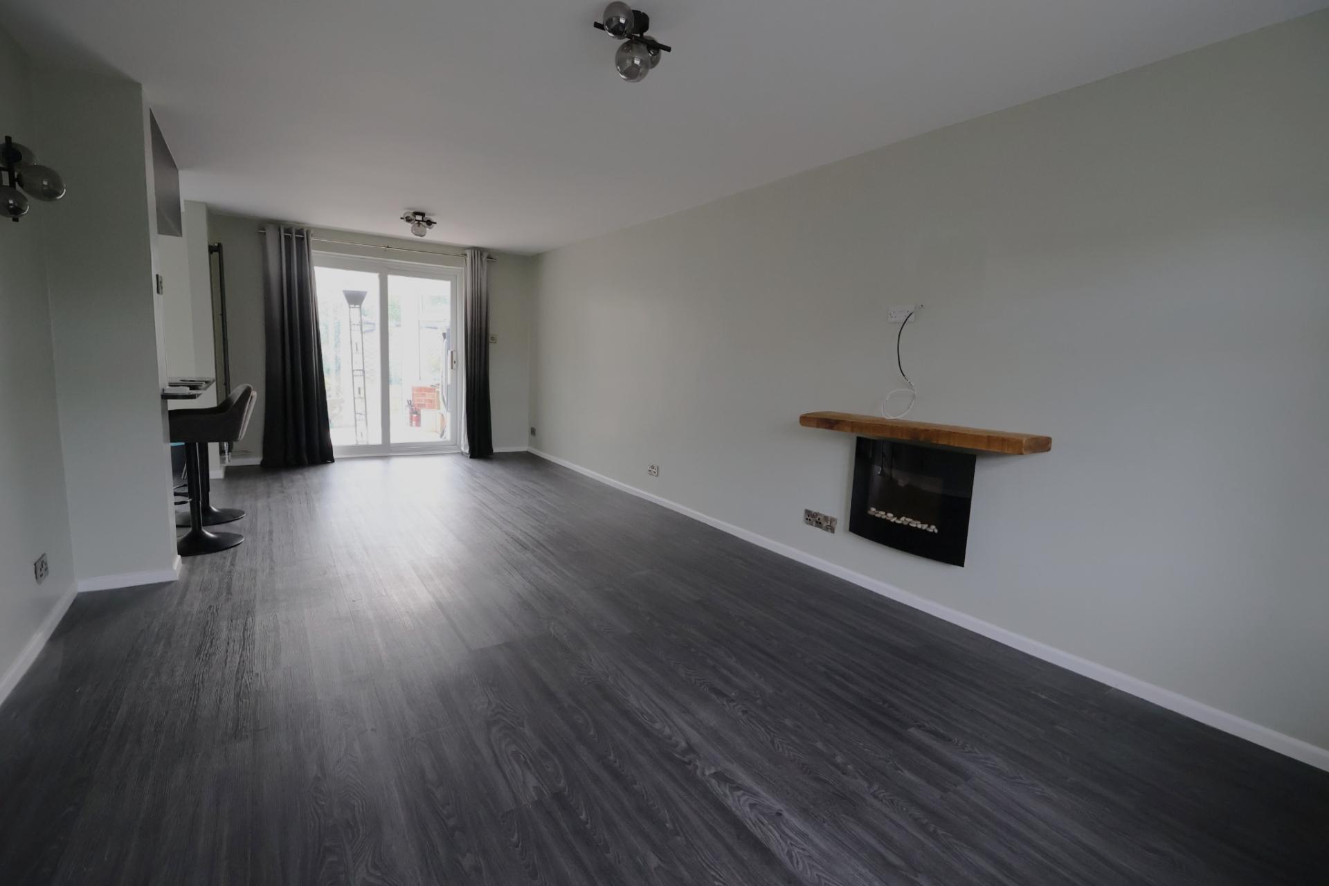 LOUNGE/ DINER/ BREAKFAST BAR – An open-plan space with an electric fireplace to the lounge area, windows to front aspect. Modern fitted kitchen units with sink & drainer, oven, gas hob & breakfast bar. Windows & door to rear garden. Sliding doors leading to;