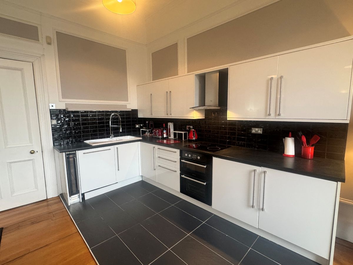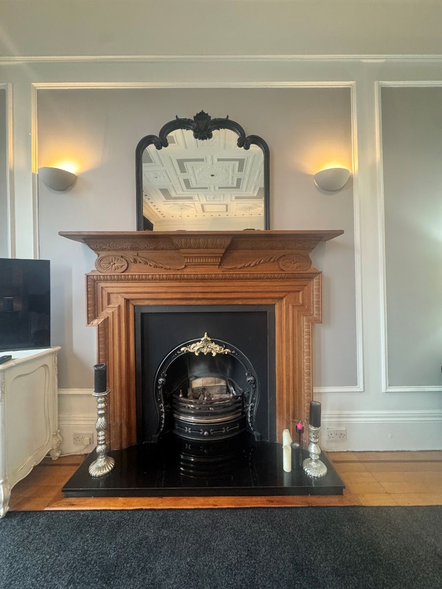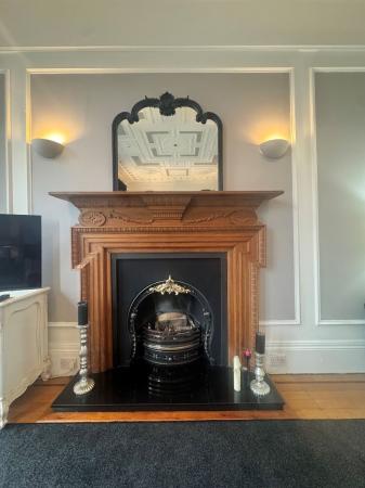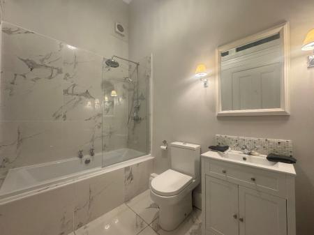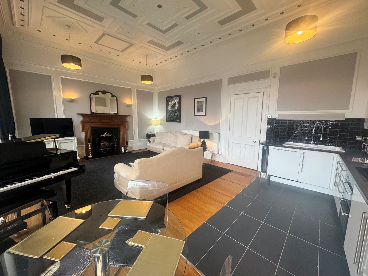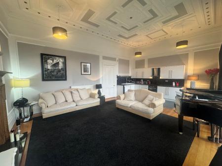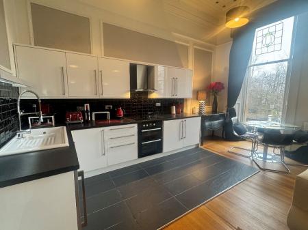 The main room is an impressive open plan lounge and kitchen with front facing bay window and full height astragal windows either side. There is a wonderful frieze ceiling and a fireplace as focal point to the room with an open gas fire.