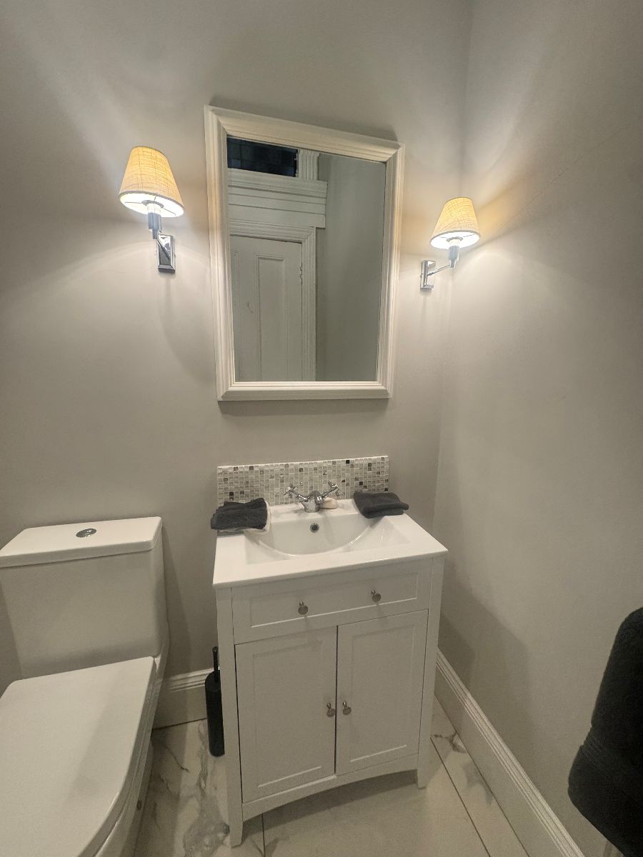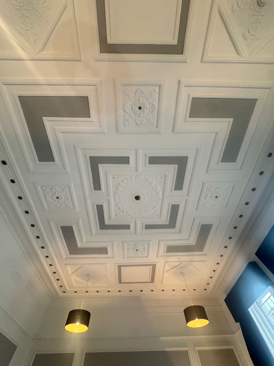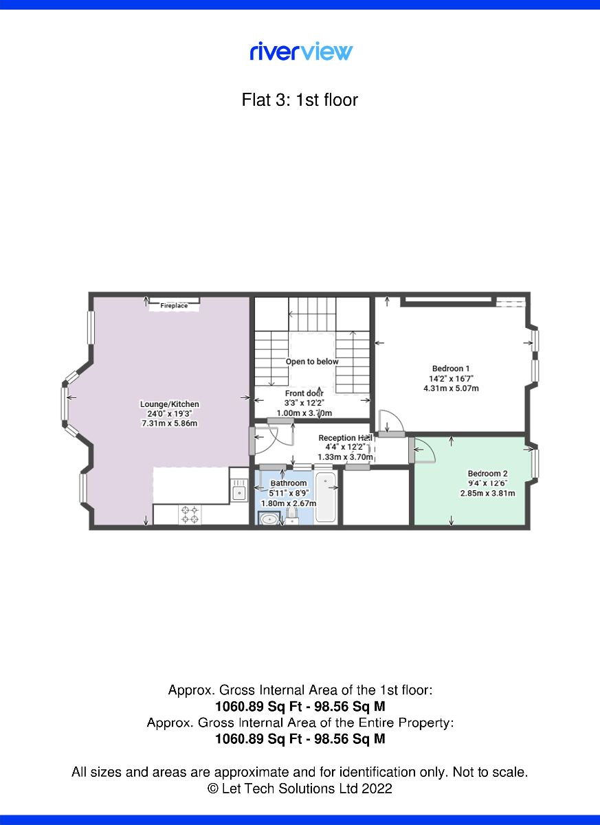 The main room is an impressive open plan lounge and kitchen with front facing bay window and full height astragal windows either side. There is a wonderful frieze ceiling and a fireplace as focal point to the room with an open gas fire.