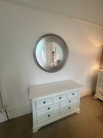 The kitchen is a white modern fitted kitchen with built in appliances and ample storage.