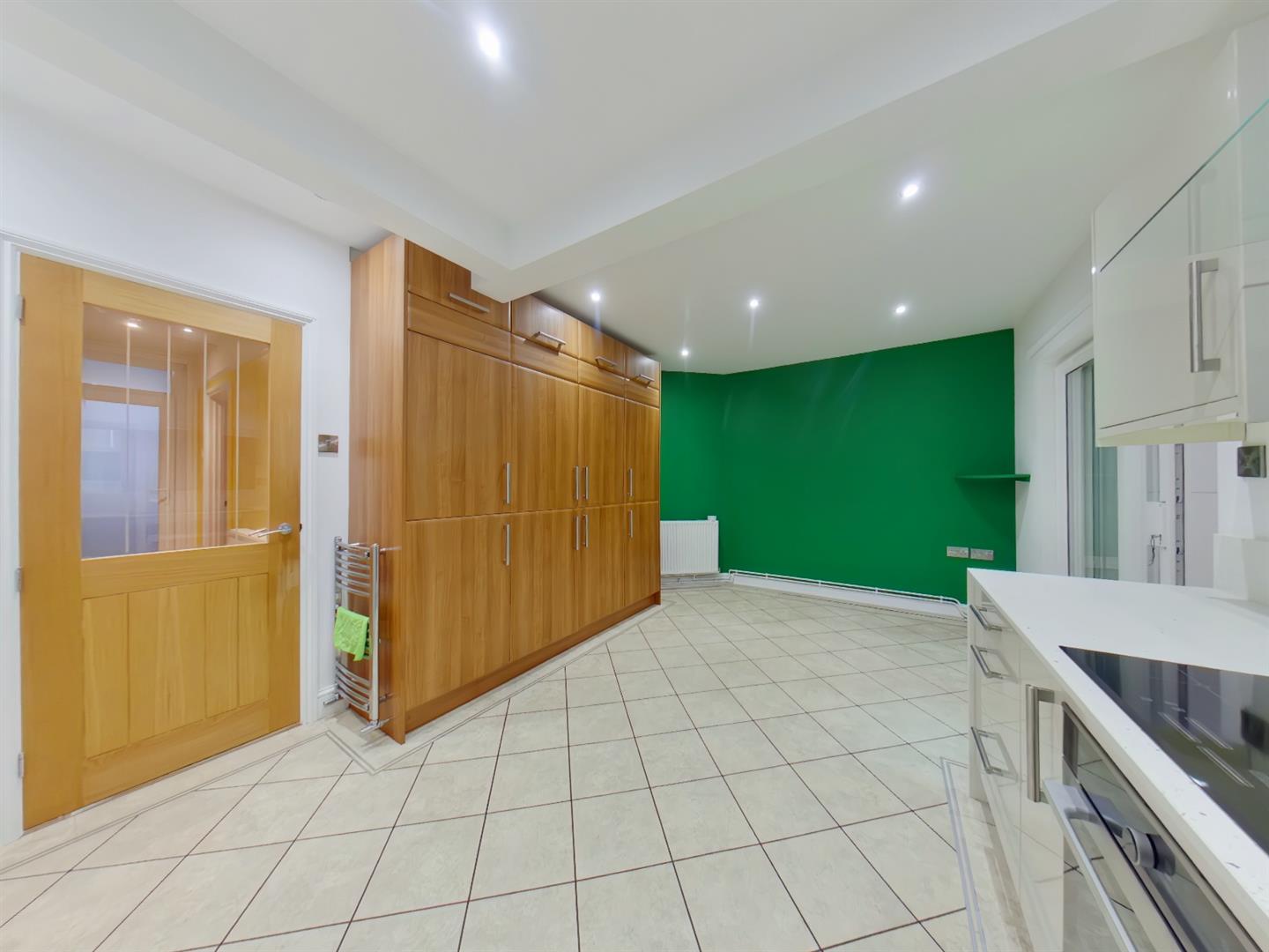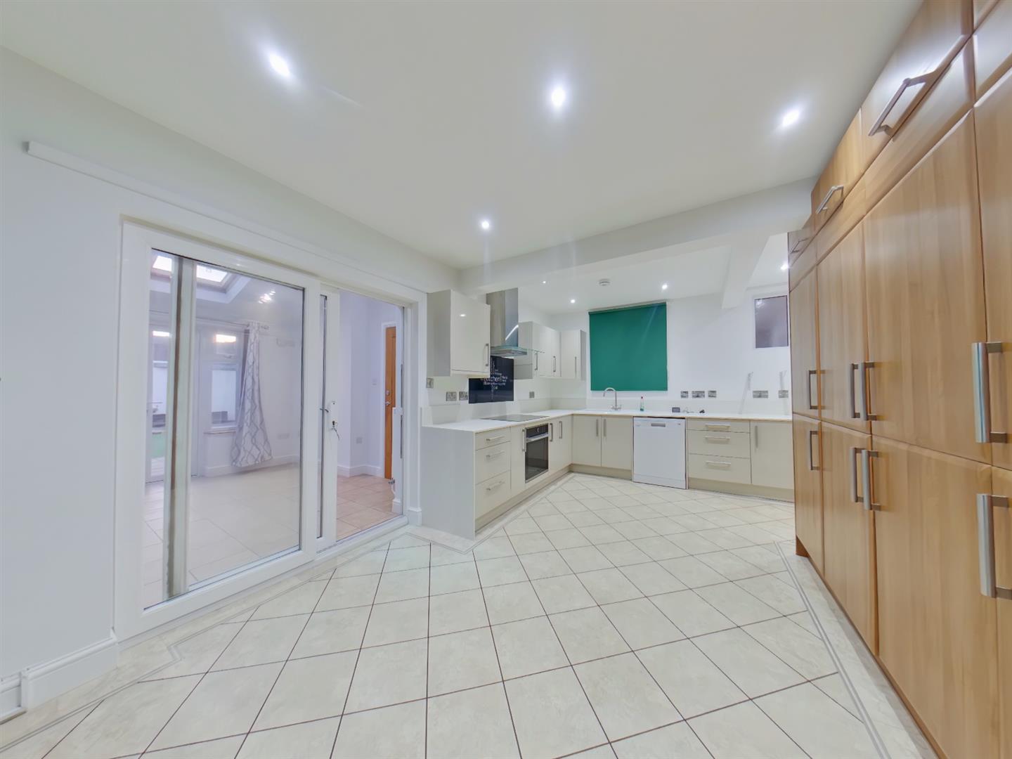 Kitchen/Diner - 5.34 x 3.33 (17'6" x 10'11") - Two double glazed windows to side elevation, fitted with a comprehensive range of wall and base cupboard/drawer units with Quartz work surfaces over, integrated appliances including a five ring induction hob, with chimney hood above and electric oven under, integrated larder fridge and fridge/freezer, inset one and half bowl porcelain sink unit with mixer tap, plumbing for dishwasher, space for dining table and chairs, Karndean flooring, inset spotlights to ceiling, sliding patio doors to: