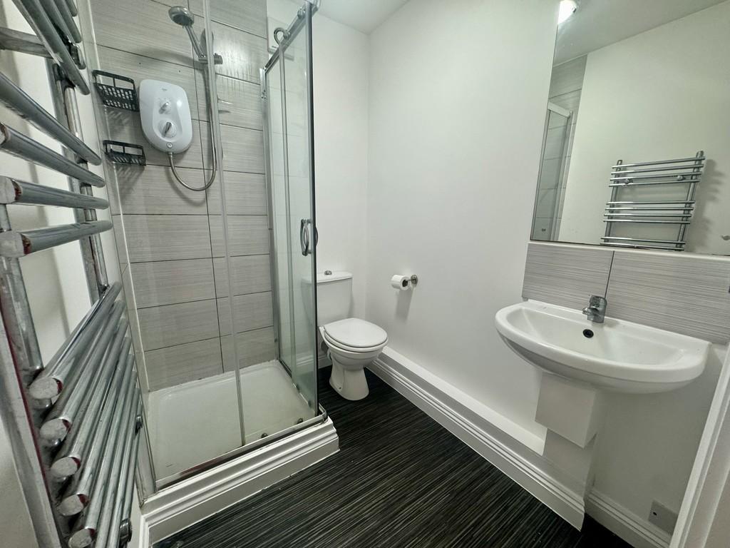 SHOWER ROOM: Fitted corner shower unit with tiled splash-back, and electric wall mounted shower with glazed screen door and shower door. White wall-mounted wash hand basin, tiled splash-back and wall mounted mirror above, white low level WC, wall-mounted electric ladder towel rail.