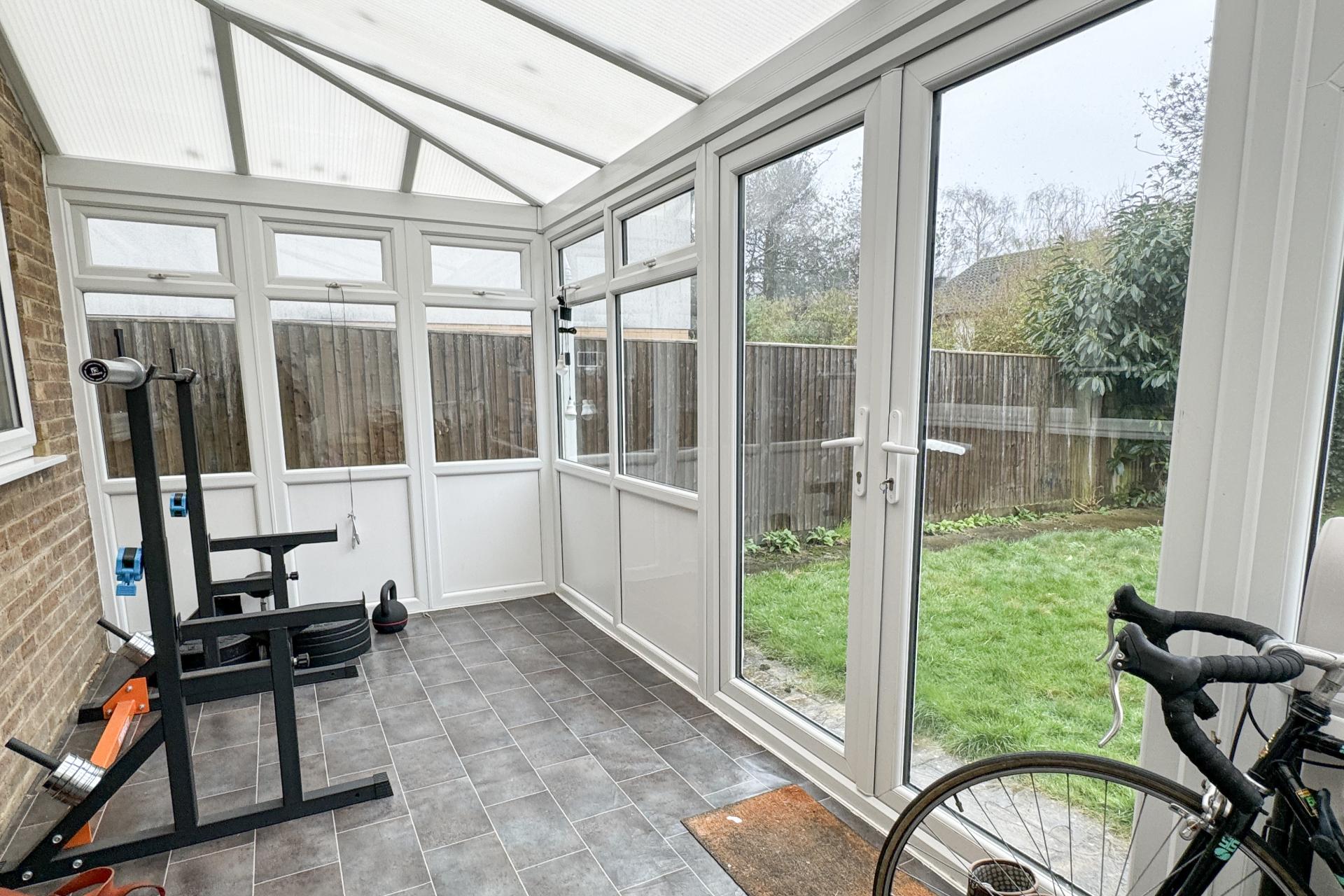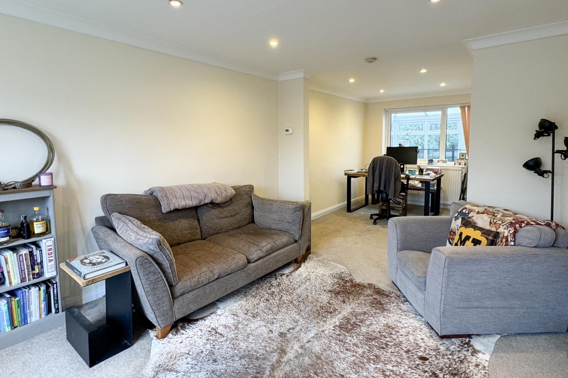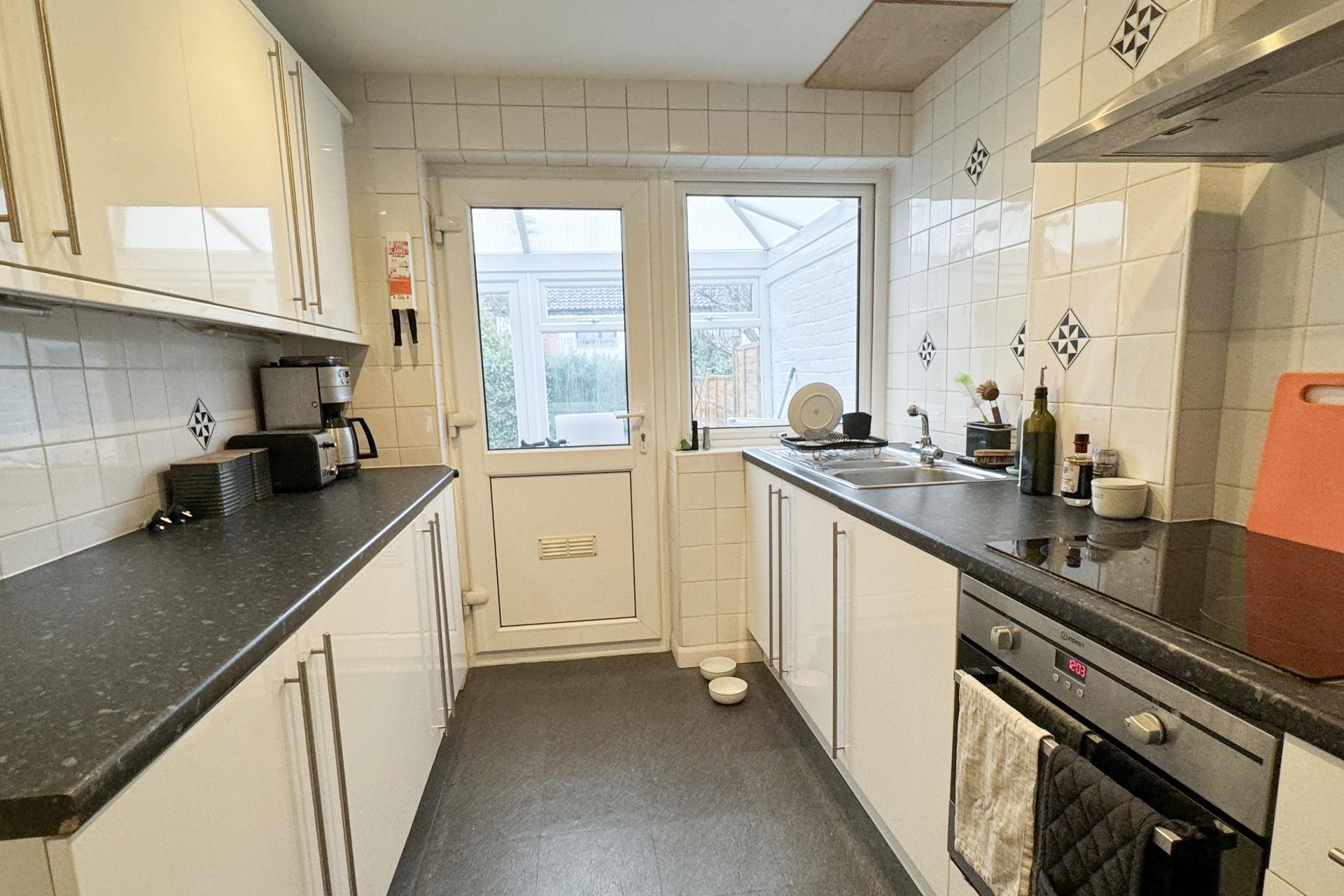 Upon entering, you are greeted by a light and bright hallway that leads seamlessly to the spacious living room and modern kitchen. The large front room features neutral decor, providing an inviting space for relaxation or entertaining guests. In the kitchen, are sleek white high gloss cupboards, a black laminate Fleck worktop, oven, halogen hob with extractor over along with space for a fridge freezer. Access to the sizable conservatory adds versatility, with space for your washing machine and additional living area. Doors leading to the garden.