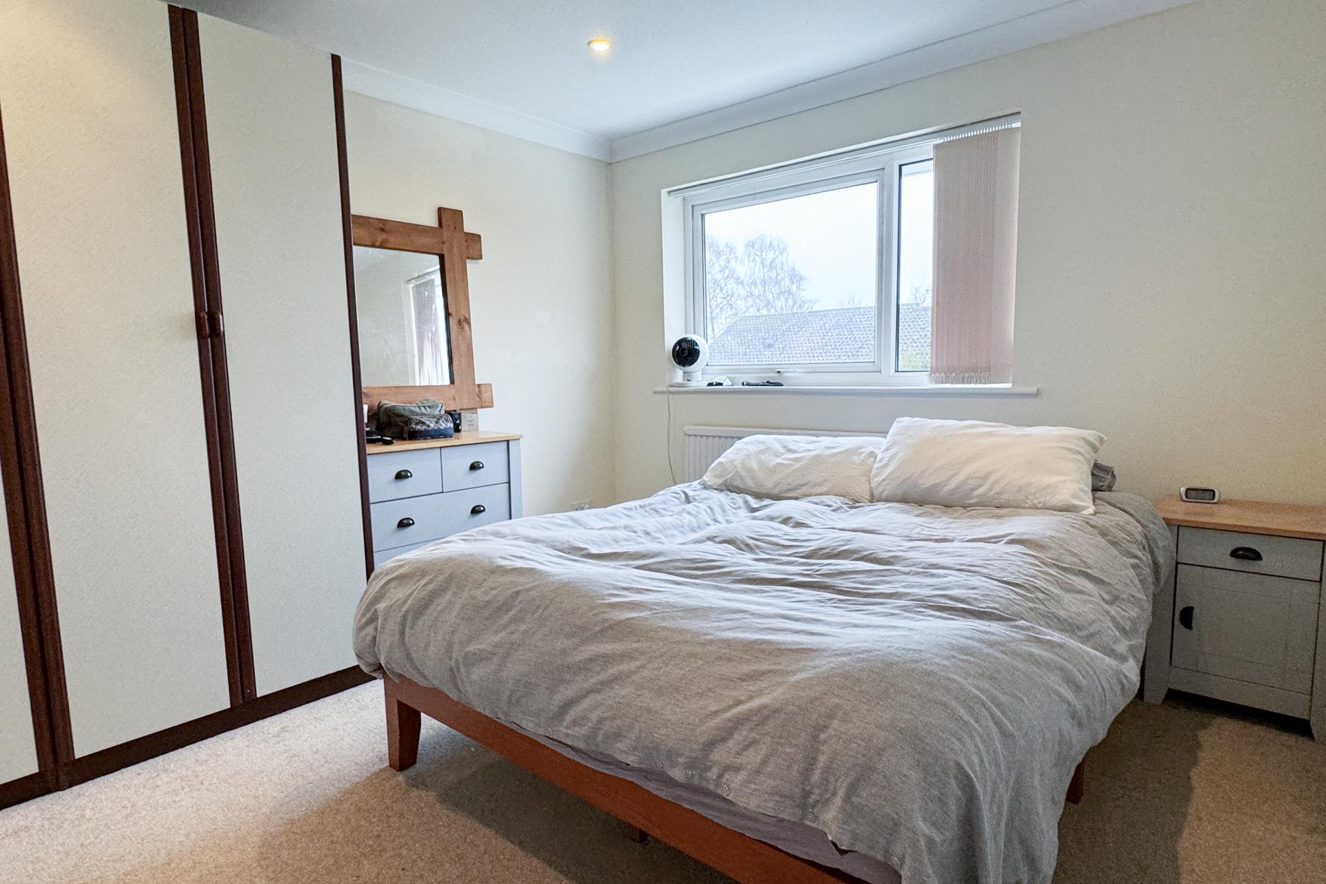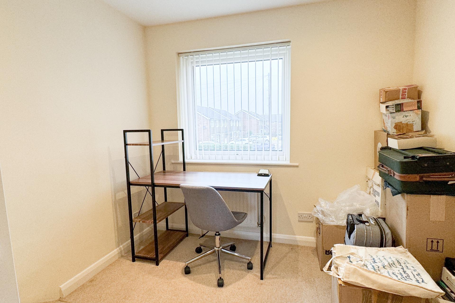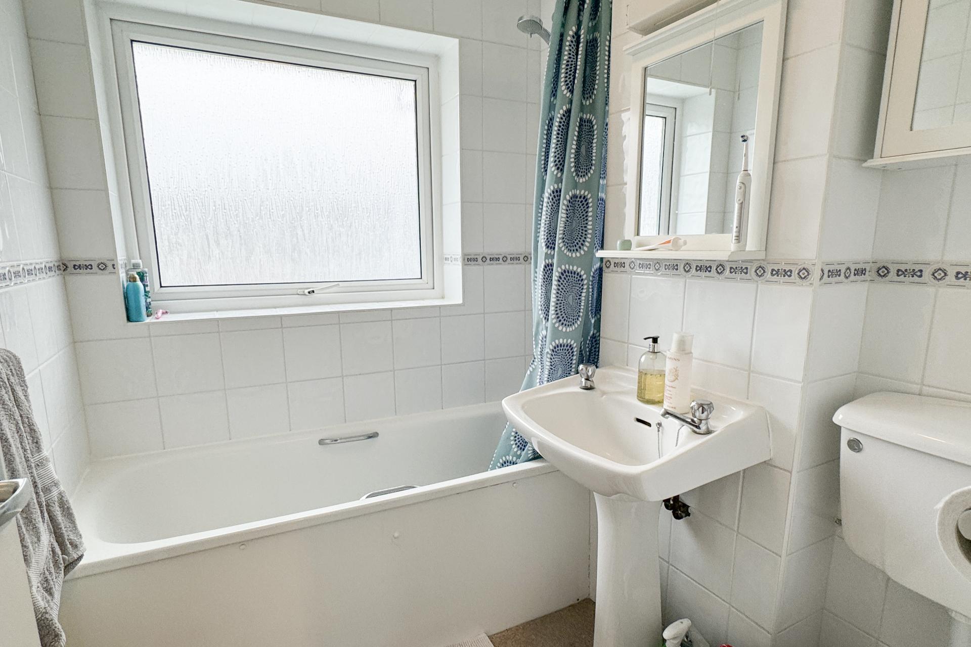 Upstairs, three double bedrooms await. The master bedroom offers a tranquil retreat, while bedroom two and bedroom three provide ample space for guests or a home office. The family bathroom boasts a white suite with a bath with shower over, complemented by silver fittings. Soft carpeting throughout the upstairs, including the bathroom.