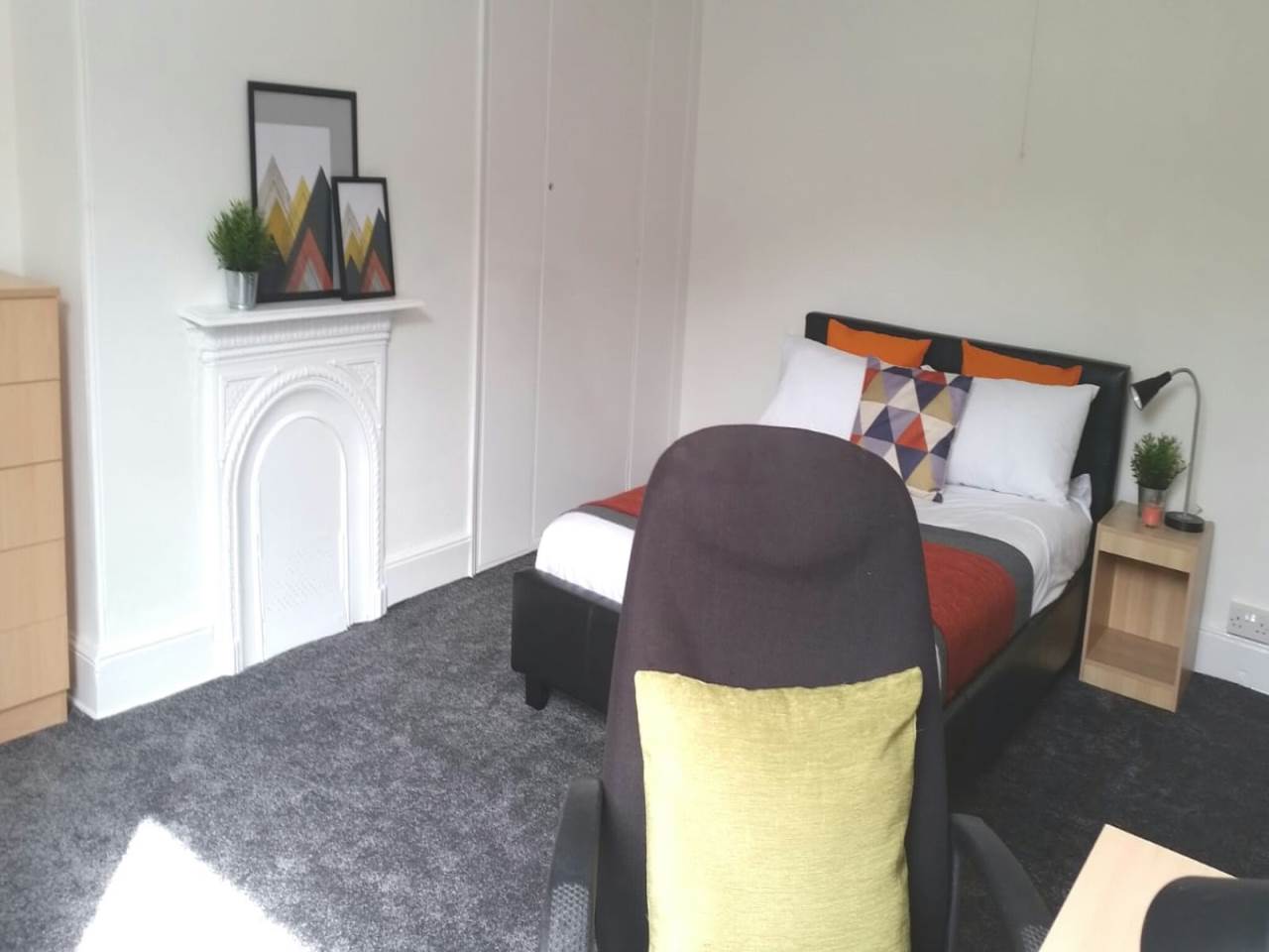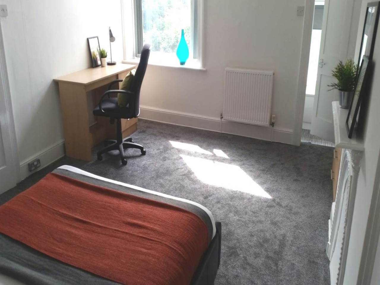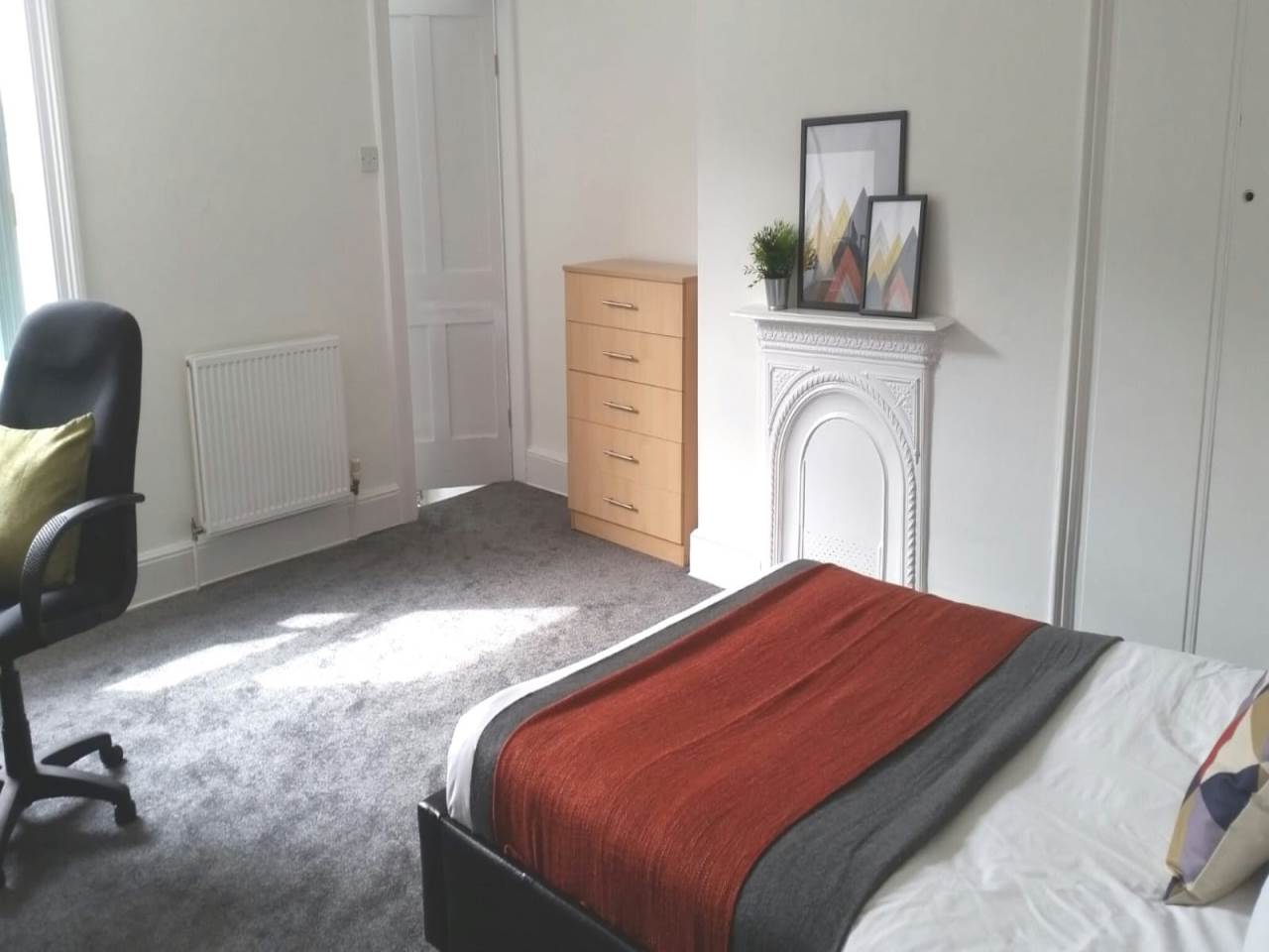Spacious double bedroom furnished with a double bed, desk, chair, drawers and wardrobe.