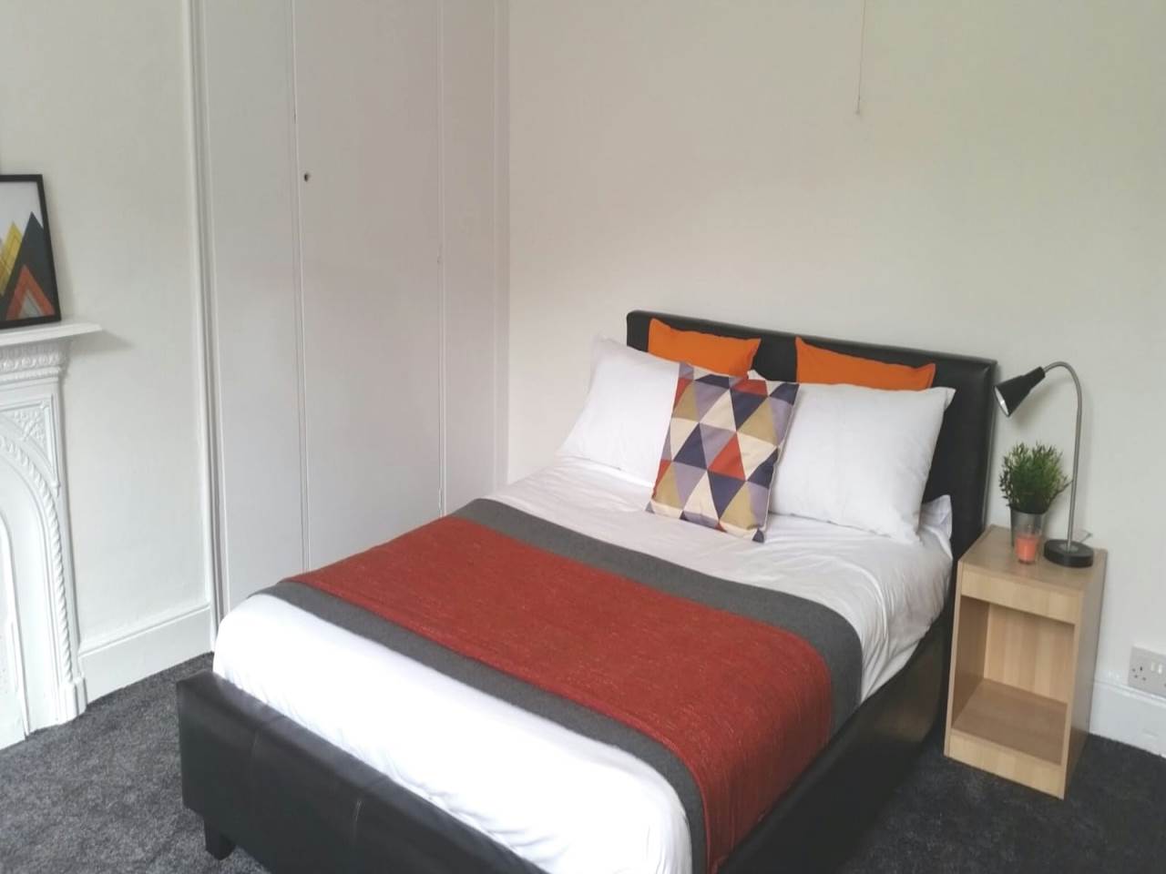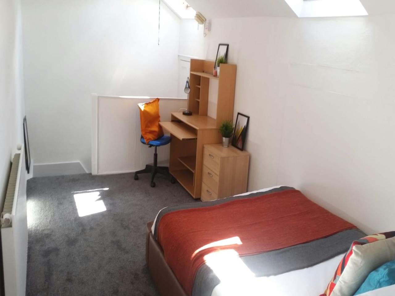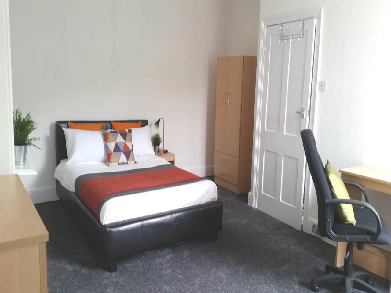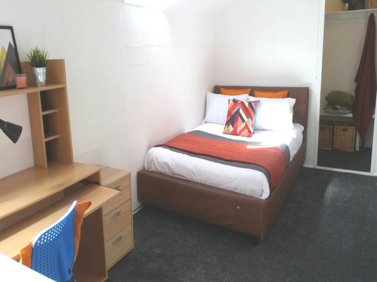 Spacious double bedroom furnished with a double bed, desk, chair, drawers and wardrobe.