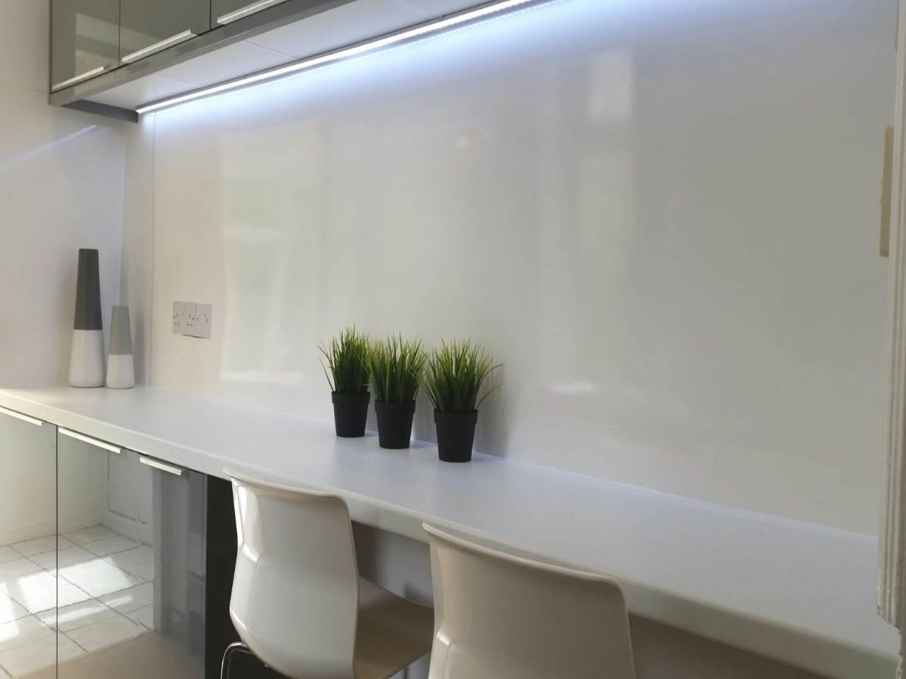 Fully furnished living room consists of a large modern leather sofa and 2 reclining armchairs, coffee table and large storage unit.