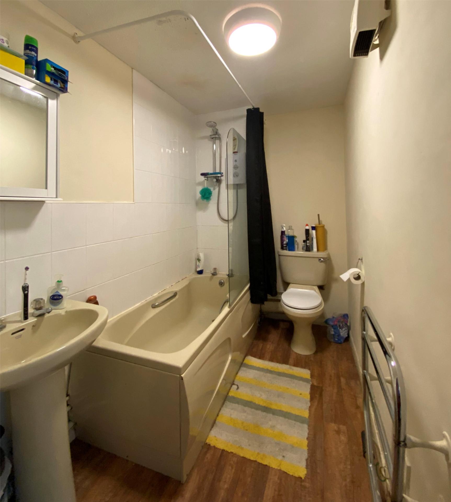 The bathroom features a bath with shower over, wash hand basin and WC.