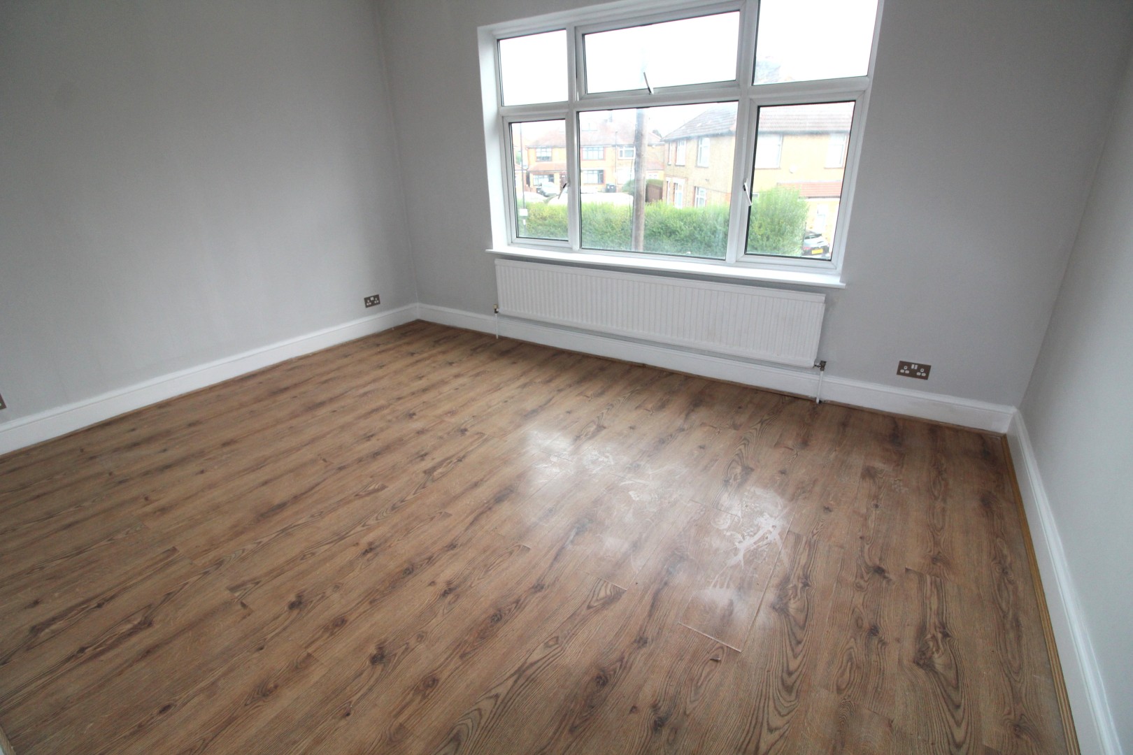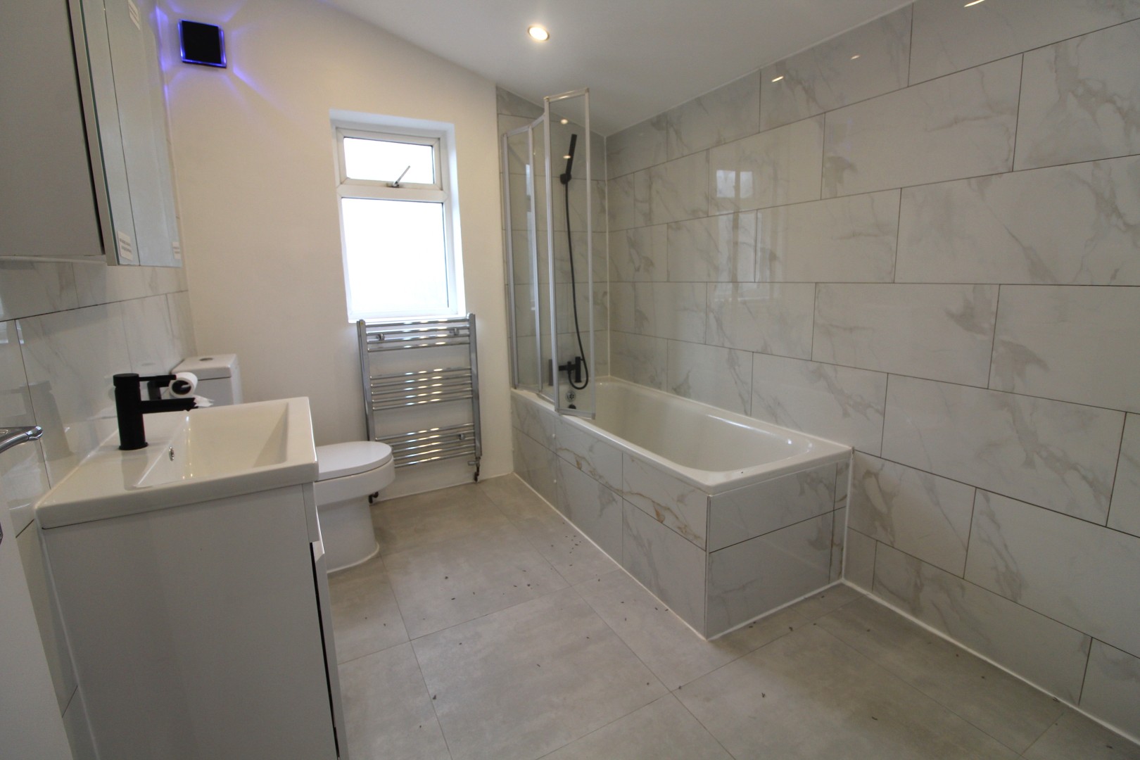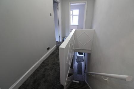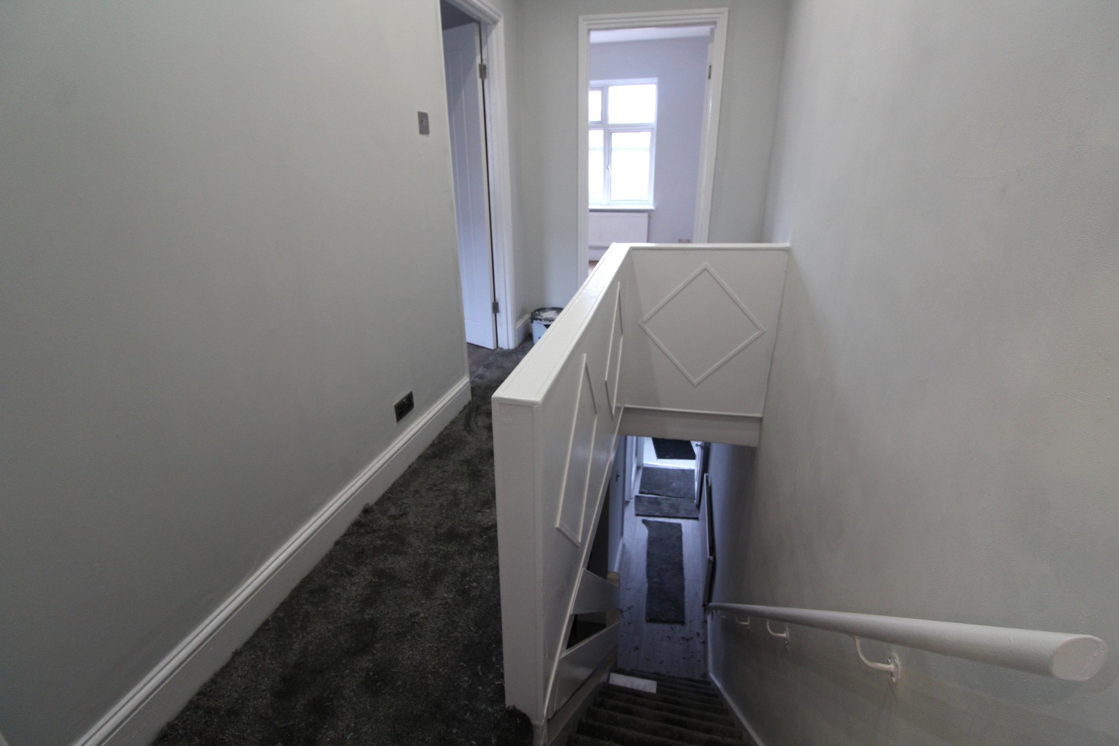 Upstairs, the property features newly fitted grey carpets on the stairs and landing. At the top of the stairs is a modern three-piece family bathroom. Along the hallway, you will find a small double bedroom and a further large double bedroom, both offering ample space and natural light.