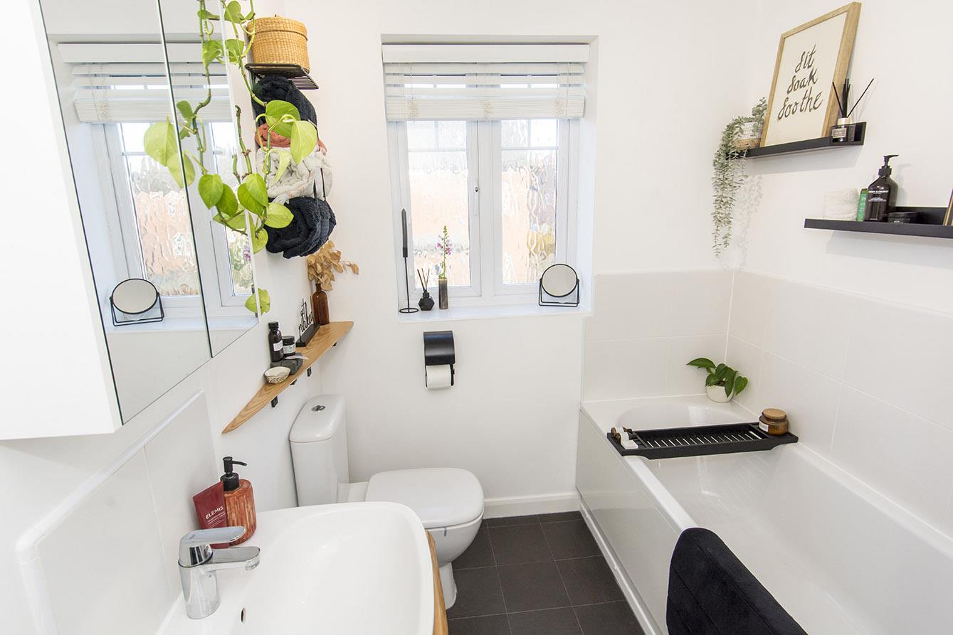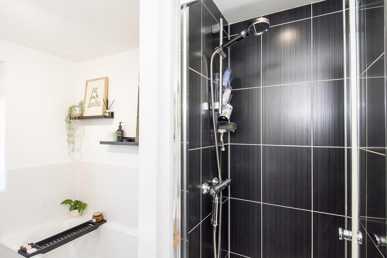 Bathroom - Panelled bath. Tiled shower cubicle with mains shower fitment. Wash hand basin. Low level wc. Tile effect vinal flooring. Complimentary tiling. Heated towel rail. Opaque double-glazed window.