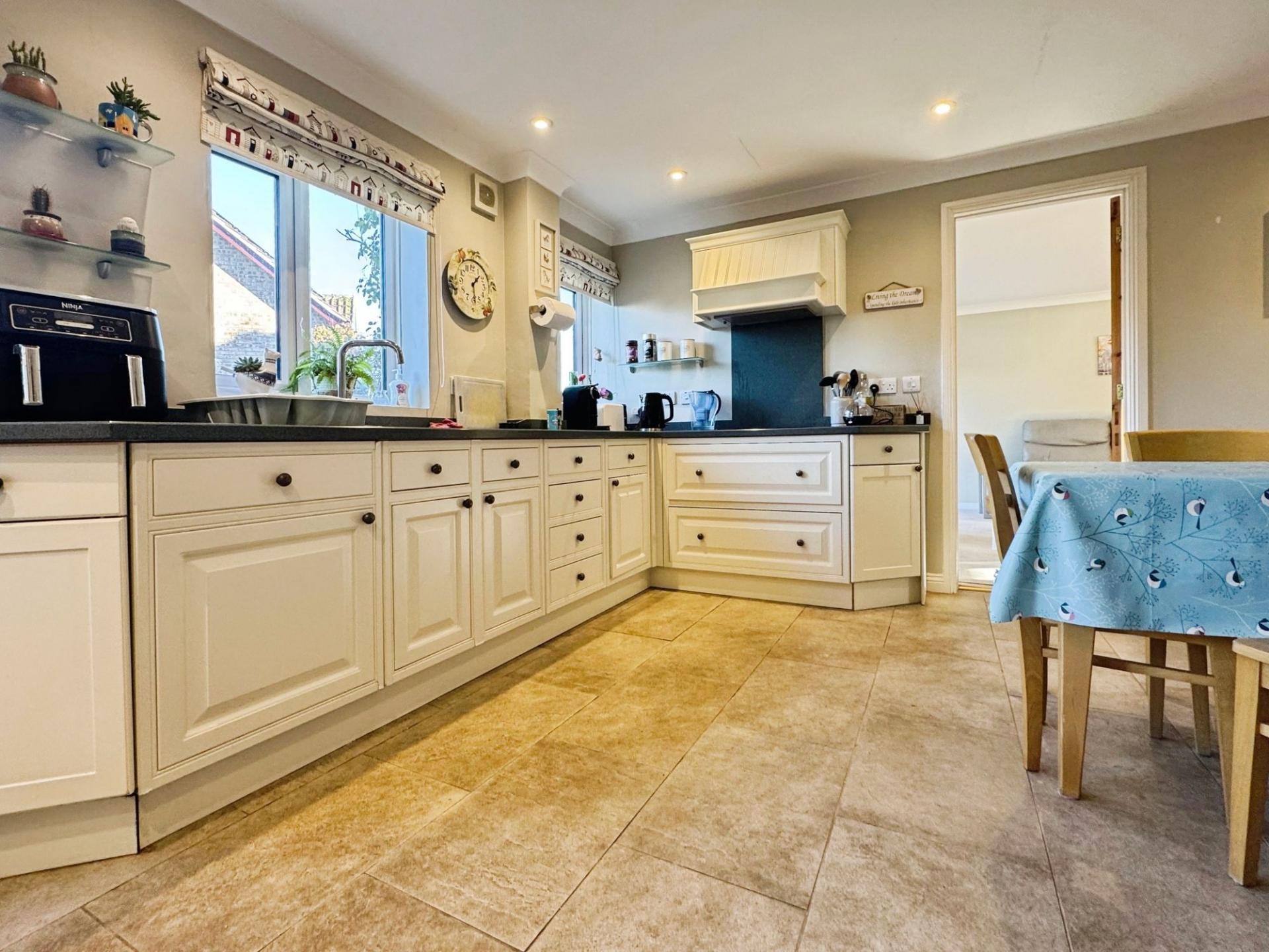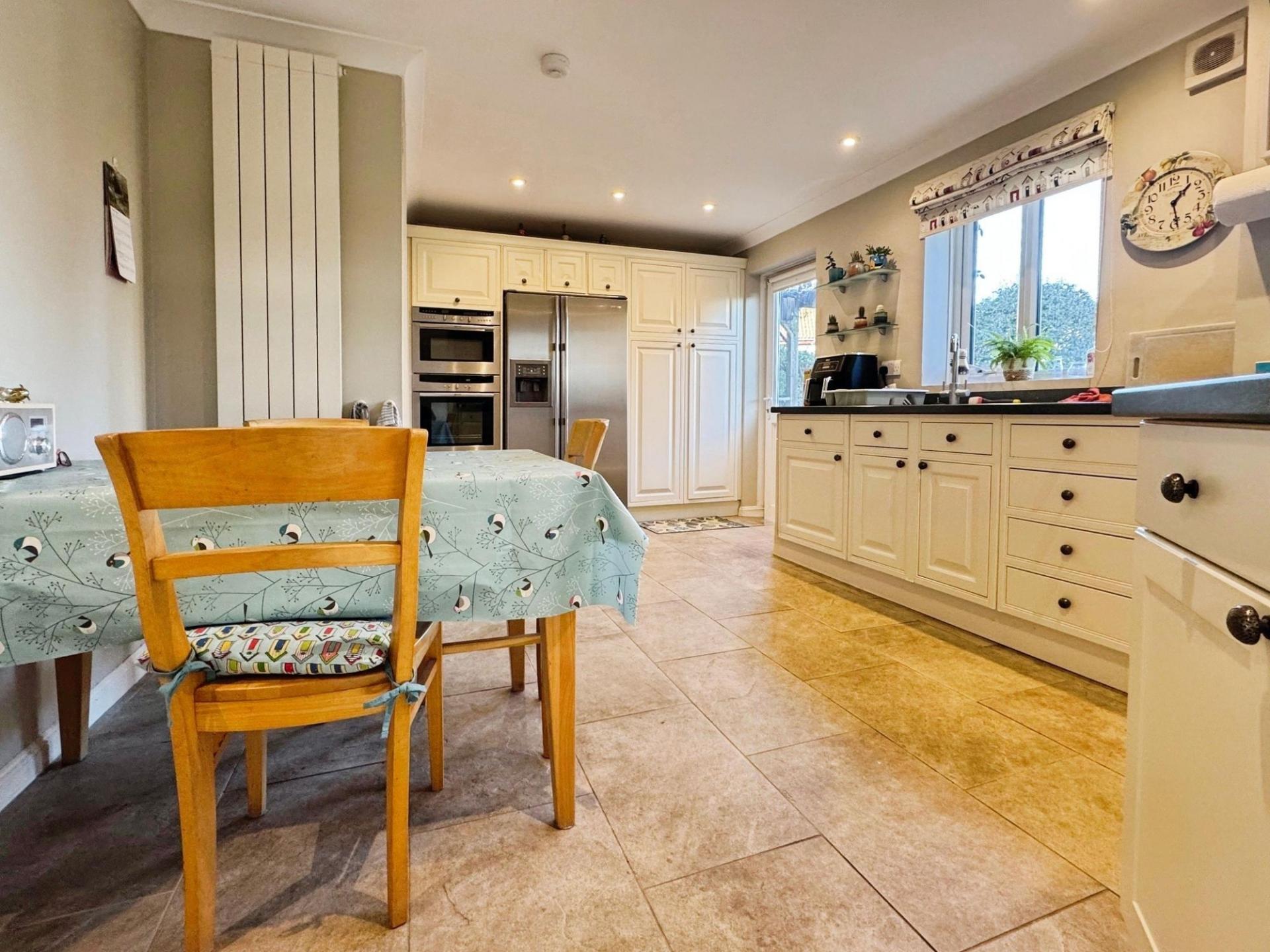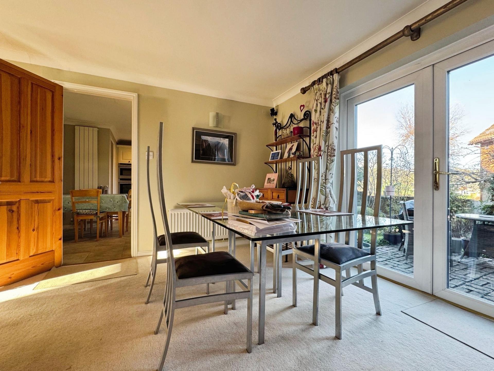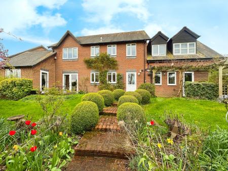 Welcome to Edwards Meadow, an expansive family residence characterised by its brick facade, tiled roof, and double glazed windows. Positioned perfectly, this residence offers versatile living spaces, adaptable to accommodate your unique lifestyle. Upon entry, the capacious hallway sets the stage, granting access to all primary rooms. The inviting sitting room features a focal wood-burner stove, ample natural light, and French doors leading to the garden, ideal for hosting guests. Adjacent lies the dining room, a generously proportioned space bathed in sunlight, courtesy of a later extension to the property. The heart of the home, the sizable kitchen/breakfast room, is equipped with integrated appliances and seamlessly connects to both a utility room and workshop, with convenient garage access. For those working remotely, the study with its wooden flooring provides an ideal workspace, while a downstairs WC completes the ground floor amenities. Ascending to the first floor, a spacious landing serves as a gateway to five bedrooms, three of which offer picturesque rear views. The primary bedroom features abundant built-in wardrobes and an en-suite bathroom with bath and overhead shower, while the remaining bedrooms boast similar wardrobe provisions, with the second bedroom also offering its own en-suite.