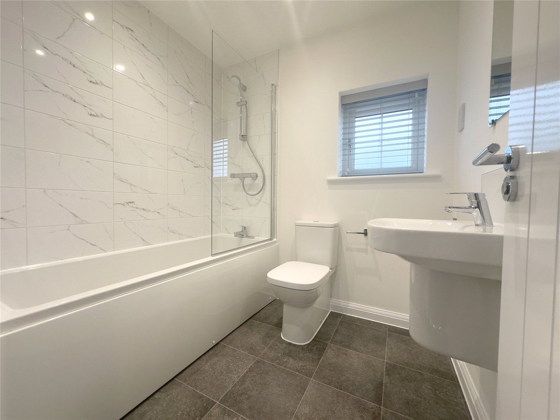 FAMILY BATHROOM 6'3" × 6'7" (1.9m × 2m). With white hand basin and mixer tap, towel rail, shaving point, mounted mirror, and low-level WC with push flush. White bath with mixer tap, glass screen and showerhead. Frosted double glazed windows with fitted blinds.