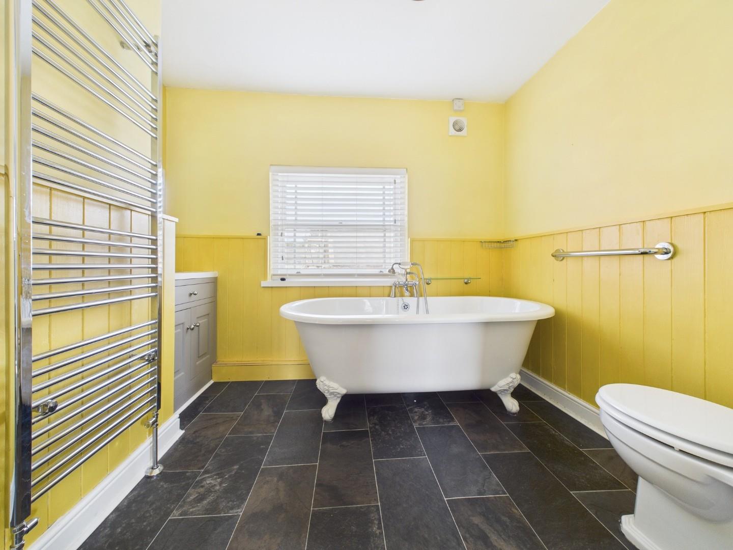 Ensuite - 2.22 x 2.27 (7'3" x 7'5") - A doorway from the master bedroom opens into a stylish ensuite, complete with a freestanding bathtub, a low-flush WC, and a modern vanity sink unit with a mixer tap. A rear-aspect window brings in plenty of natural light into the space.