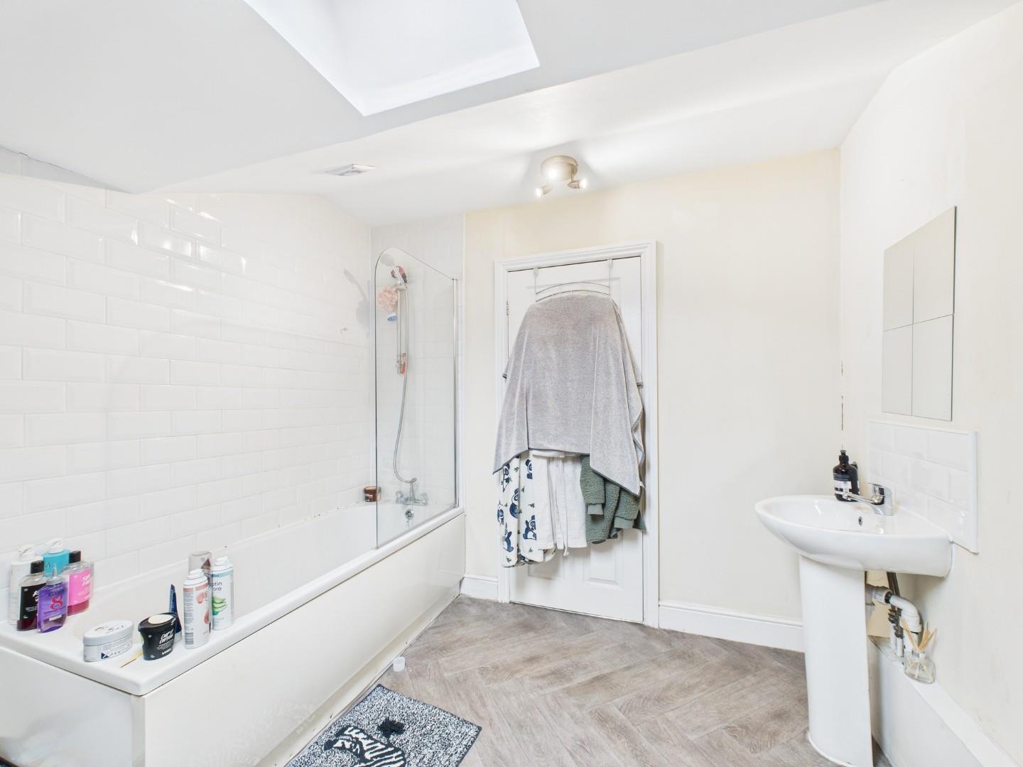 Bathroom - 3.01 x 2.76 (9'10" x 9'0") - With a skylight, wood effect vinyl floor covering and ceiling light fitting. This bathroom is fitted with a panelled bathtub with mains shower over, a dual flush WC and a pedestal wash hand basin. There's also a chrome ladder style heated towel rail. This is a good sized room.