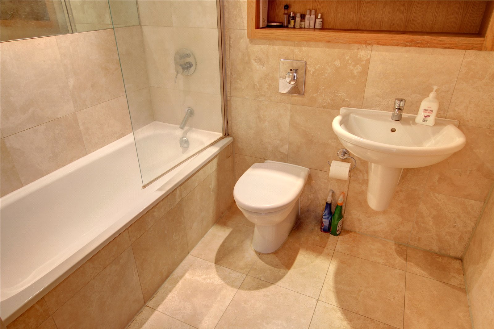 Panelled bath with hand held shower, WC, pedestal wash hand basin with mixer tap, electric shaver point, and fully tiled walls.