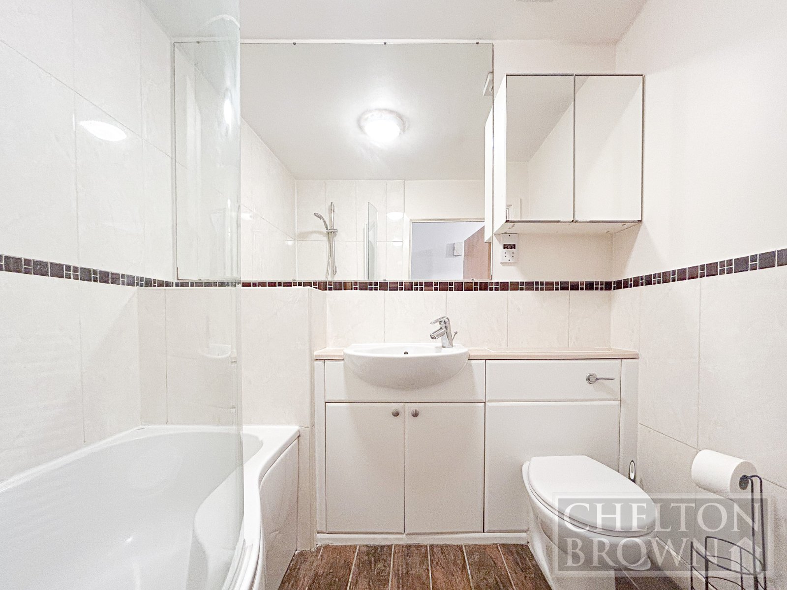 The master bedroom is a well-proportioned double room with two built-in wardrobes providing ample storage, while the second bedroom is versatile, suitable as a large single or small double. The bathroom is bright and modern, featuring a shower over the bath. Additionally, the hallway includes a large storage cupboard that houses the boiler.