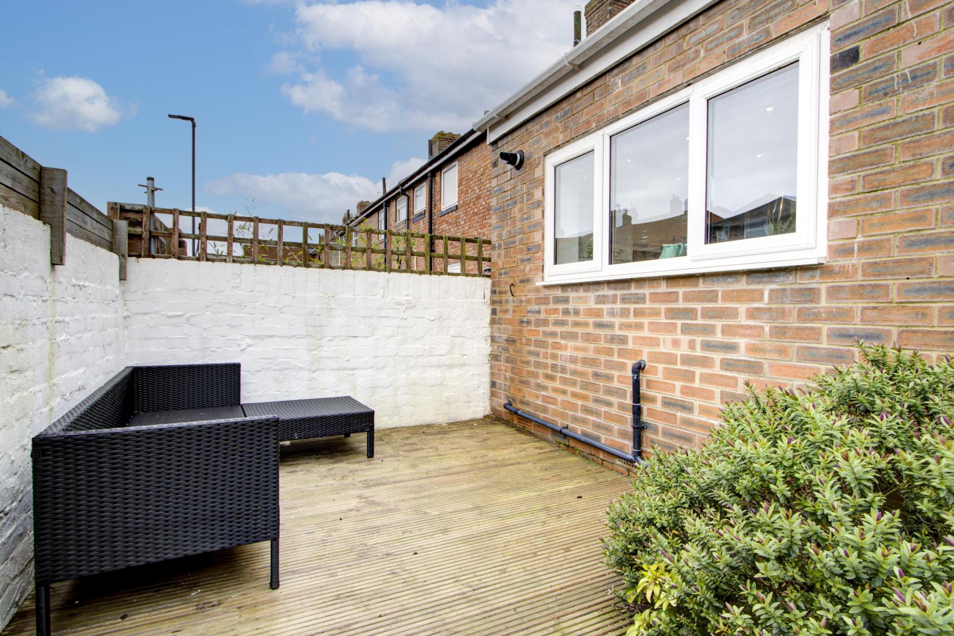 Private yard with a decking area and a gate to the rear lane.