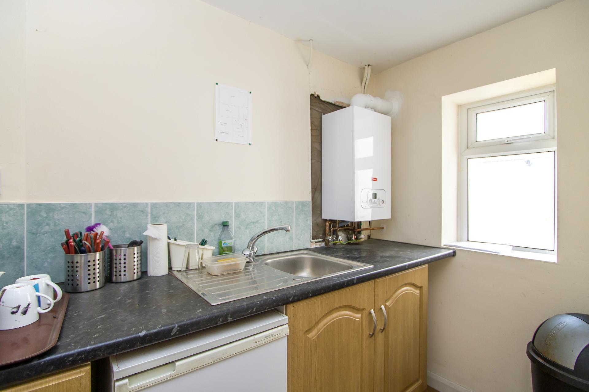 Vinyl floor. Fitted base units and work surface. Sink with drainer. Gas boiler. uPVC double glazed window to the side.