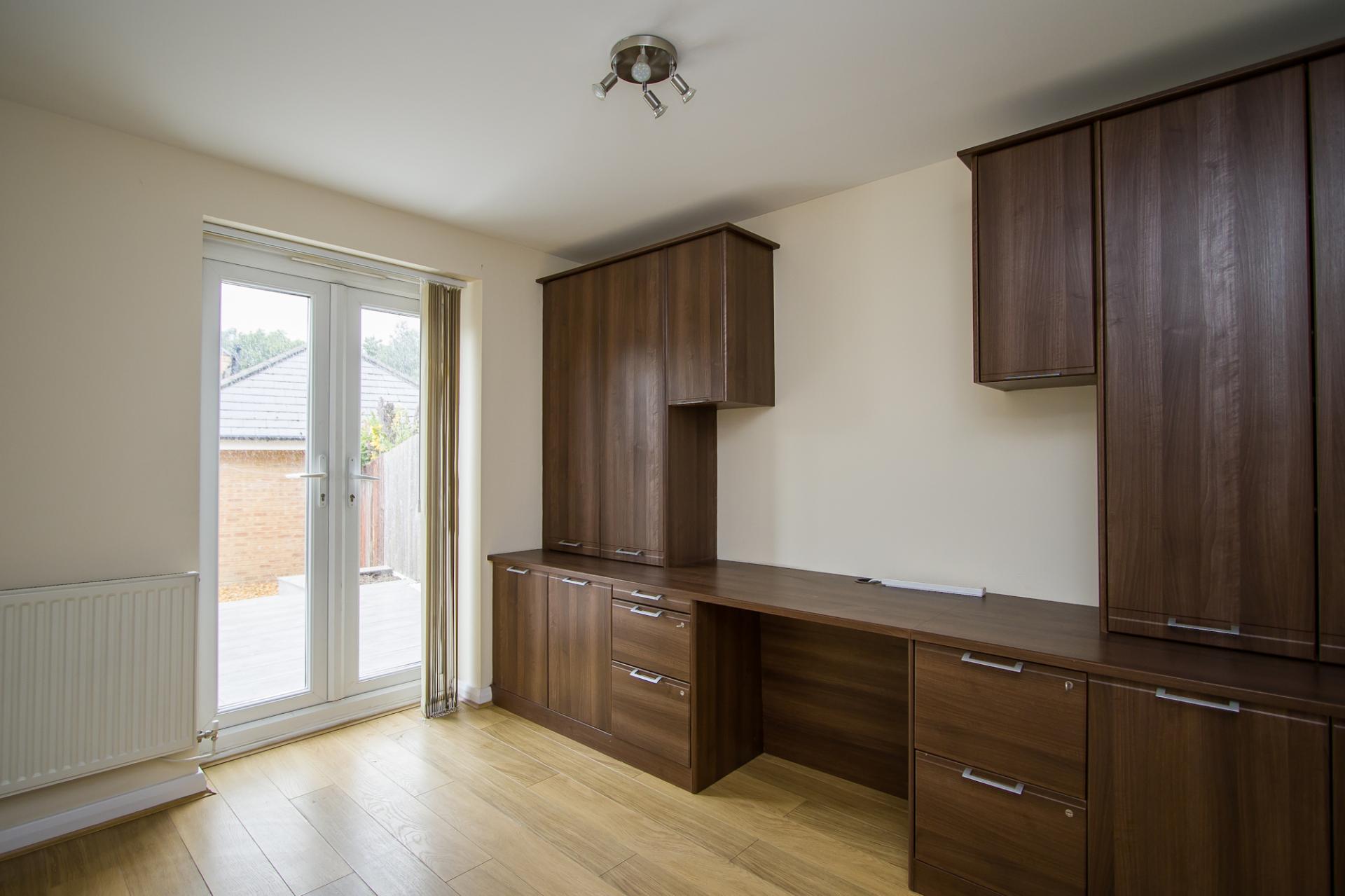 Laminate flooring and a range of custom made, fitted office furniture providing desk and storage space. uPVC double glazed French doors to the garden. Power points. Phone point. Double central heating radiator.