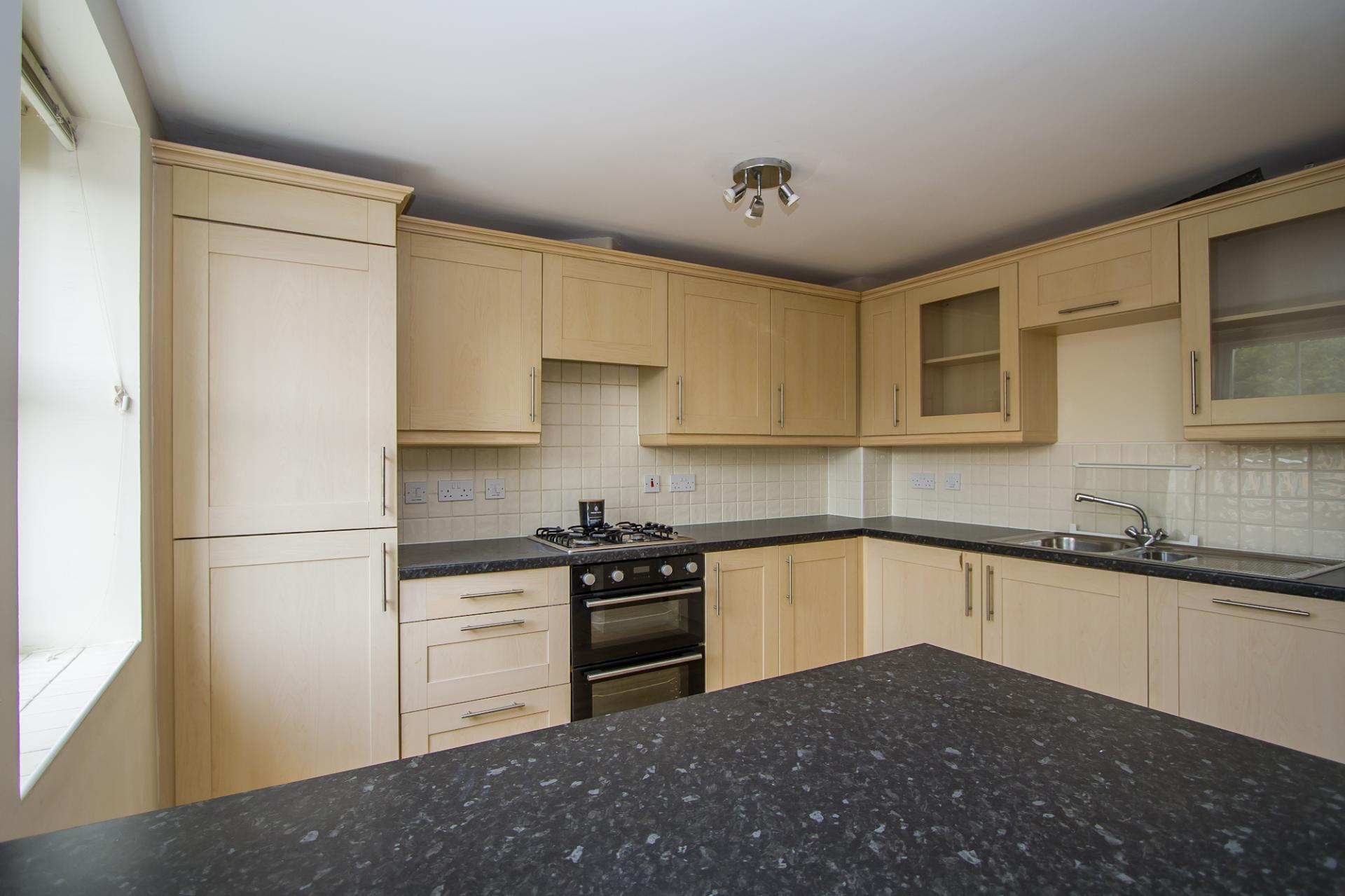 Fitted kitchen with central island providing informal dining space. Wall and base units with granite effect work surfaces. Integrated appliances including an electric oven, grill, extractor hood, four burner gas hob, fridge, freezer and dishwasher. Part tiled walls and Karndean flooring. One and a half bowl stainless steel sink with single drainer. Double central heating radiator. Two south west facing uPVC double glazed windows to the rear with fitted Venetian blinds. Power points.