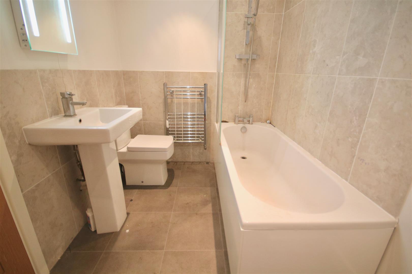 Bathroom - Tile effect flooring, range of smooth and tiled walls, three piece bathroom suite, shower over bath, heated towel rail.